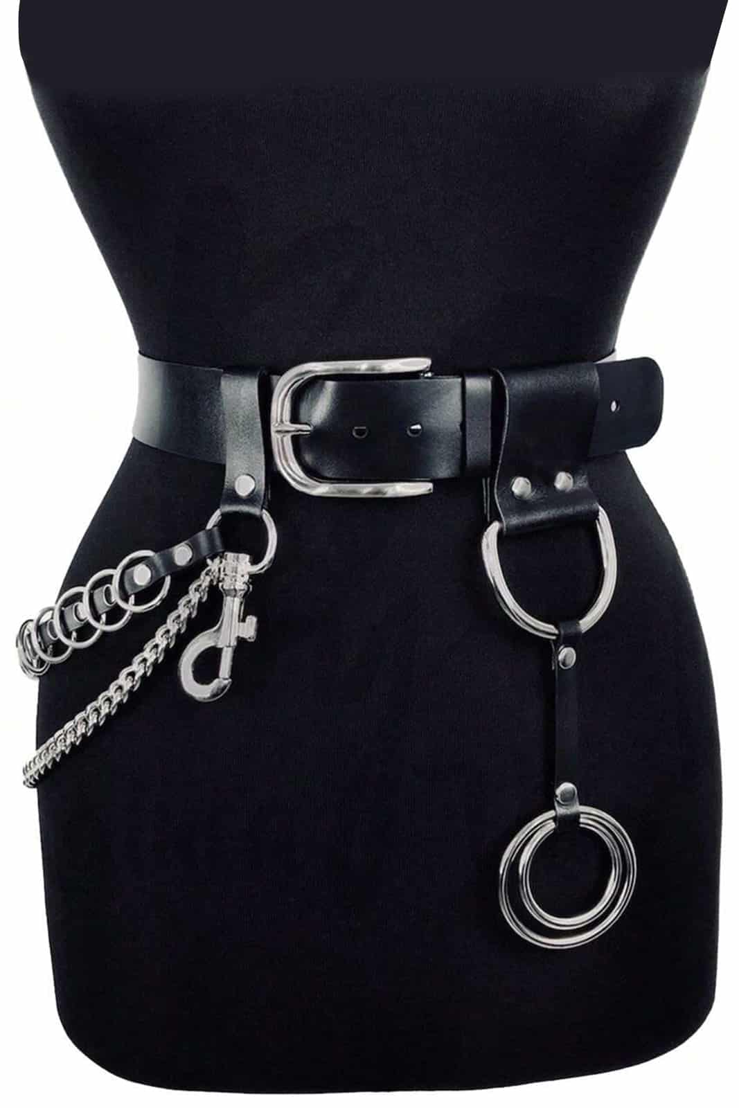 Gürtel aus hochwertigem Kunstleder verziert mit O-Ringen, Ketten und Karabinern. Passend für einen Taillenumfang von 69-95 cm.