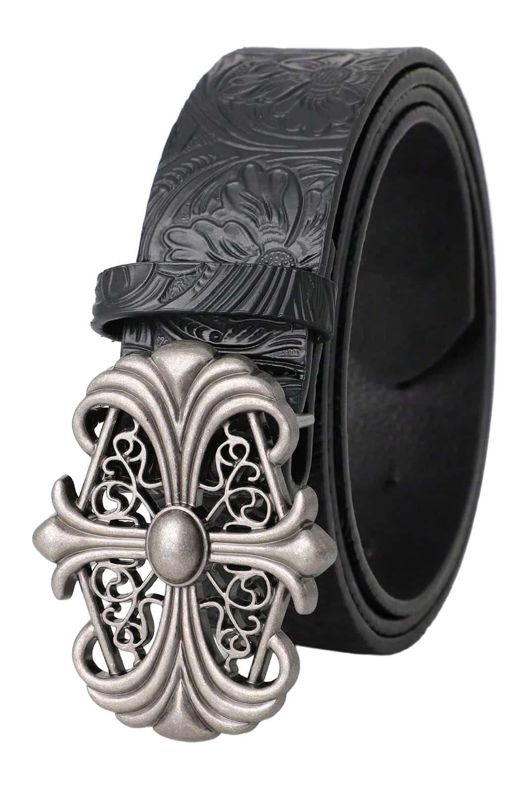 Dunkle Eleganz trifft auf kunstvolle Ornamentik – dieser Gürtel setzt mit seiner filigranen Kreuzschließe ein starkes Statement im Gothic Style. Geprägte florale Muster verleihen ihm eine edle Tiefe und machen ihn zum perfekten Accessoire für stilbewusste Looks.