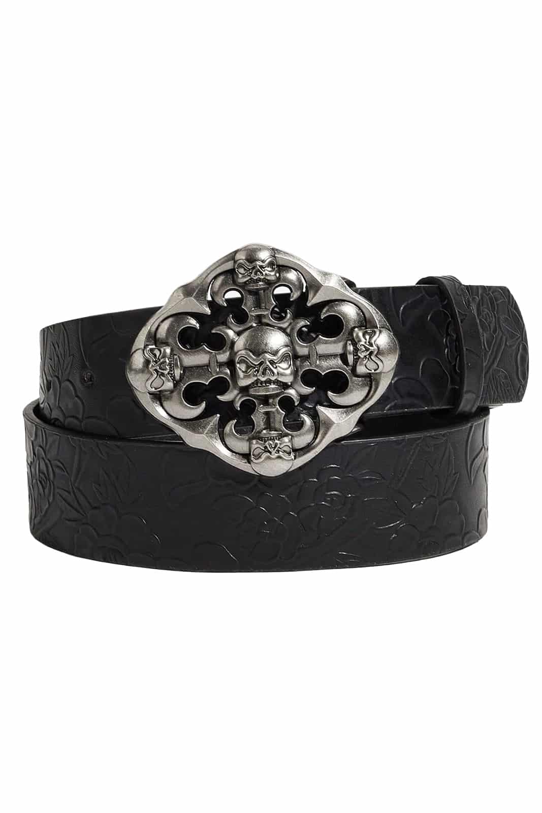 Ein kraftvolles Accessoire mit düsterem Charakter: Dieser Gürtel verbindet strukturierte Eleganz mit markanter Symbolik. Die detailreiche Schnalle mit Totenkopf- und Ornamentelementen setzt ein klares Statement, während das geprägte Kunstleder dem Design zusätzliche Tiefe verleiht – perfekt für ausdrucksstarke Gothic- und Alternative-Looks.