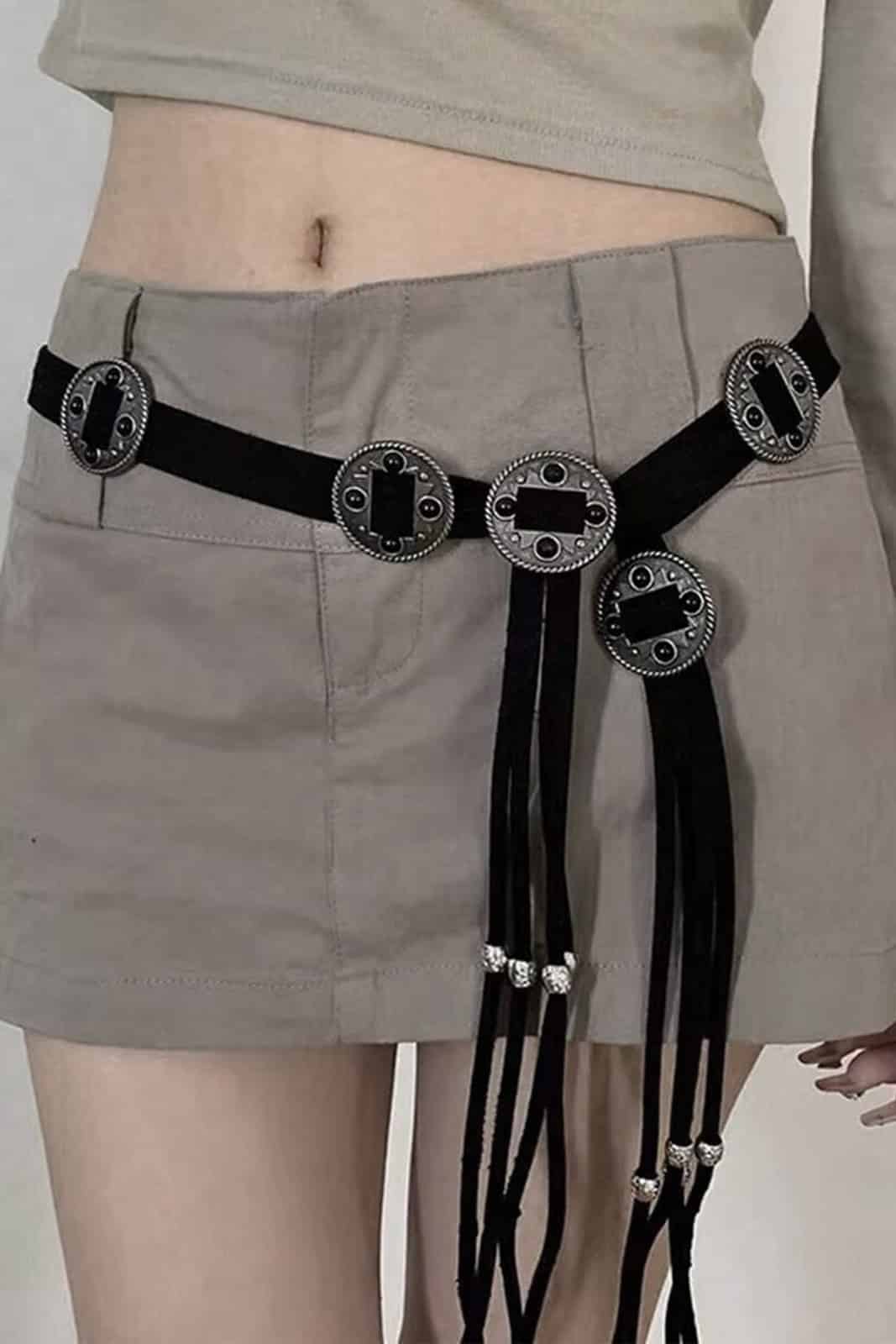Gürtel aus hochwertigem Kunstleder verziert mit Quasten und Metallscheiben.