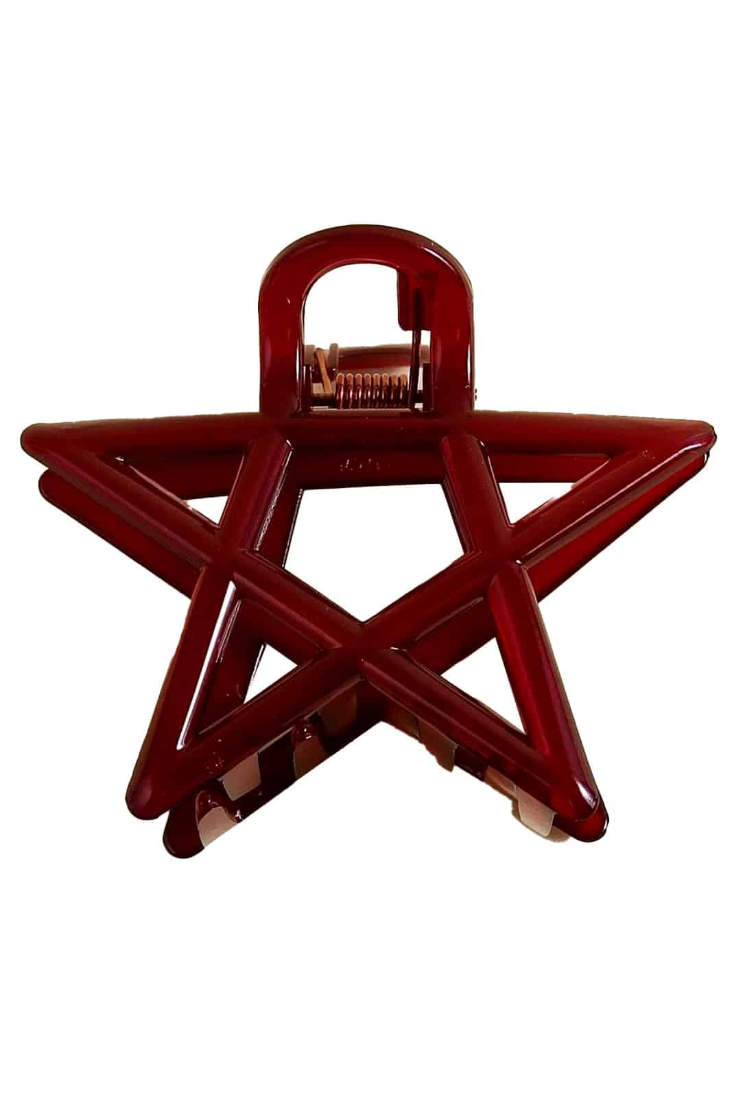 Einzelne Rote Haarklammer aus Kunststoff in Form eines Pentagramms.