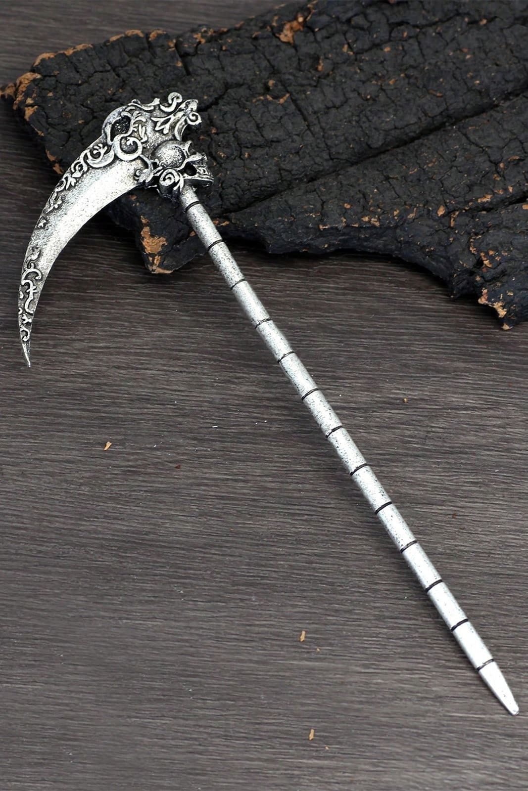 Ein Hauch von Dunkelheit für dein Styling: Diese detailreiche Haarnadel im Sensen-Design verleiht jedem Look eine geheimnisvolle, fast mystische Ausstrahlung. Fein gearbeitete Ornamente treffen auf eine markante Form – perfekt für Gothic-, Witchy- und Statement-Styles. Ob als subtiler Akzent oder als zentrales Highlight im Haar, dieses Accessoire zieht garantiert Blicke auf sich.