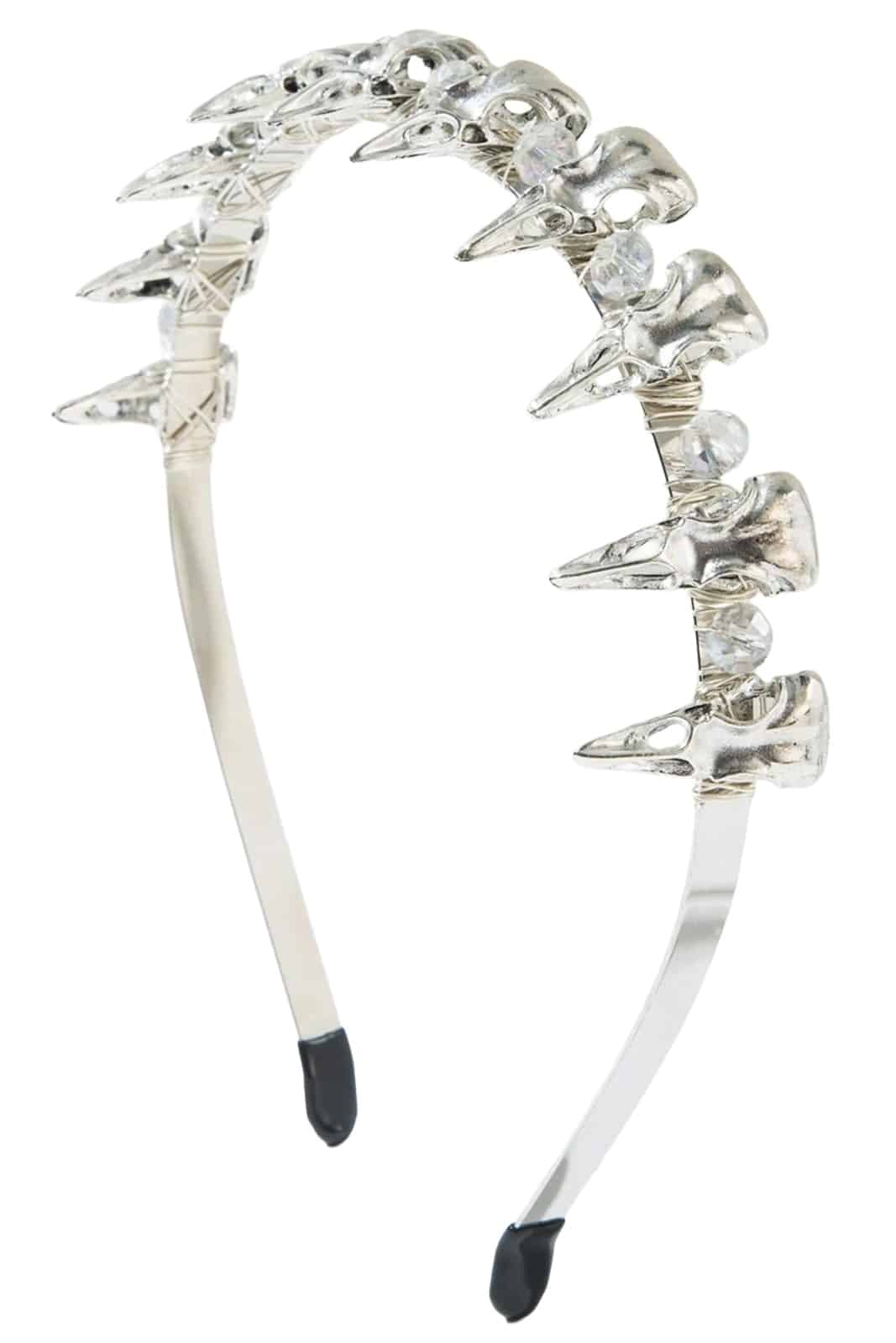 Ein dramatischer Haarreif für alle, die das Dunkle mit Eleganz verbinden. Silberfarbene Rabenschädel ziehen sich wie eine mystische Krone über den Reif, ergänzt von funkelnden Kristallsteinen, die das Licht geheimnisvoll reflektieren.