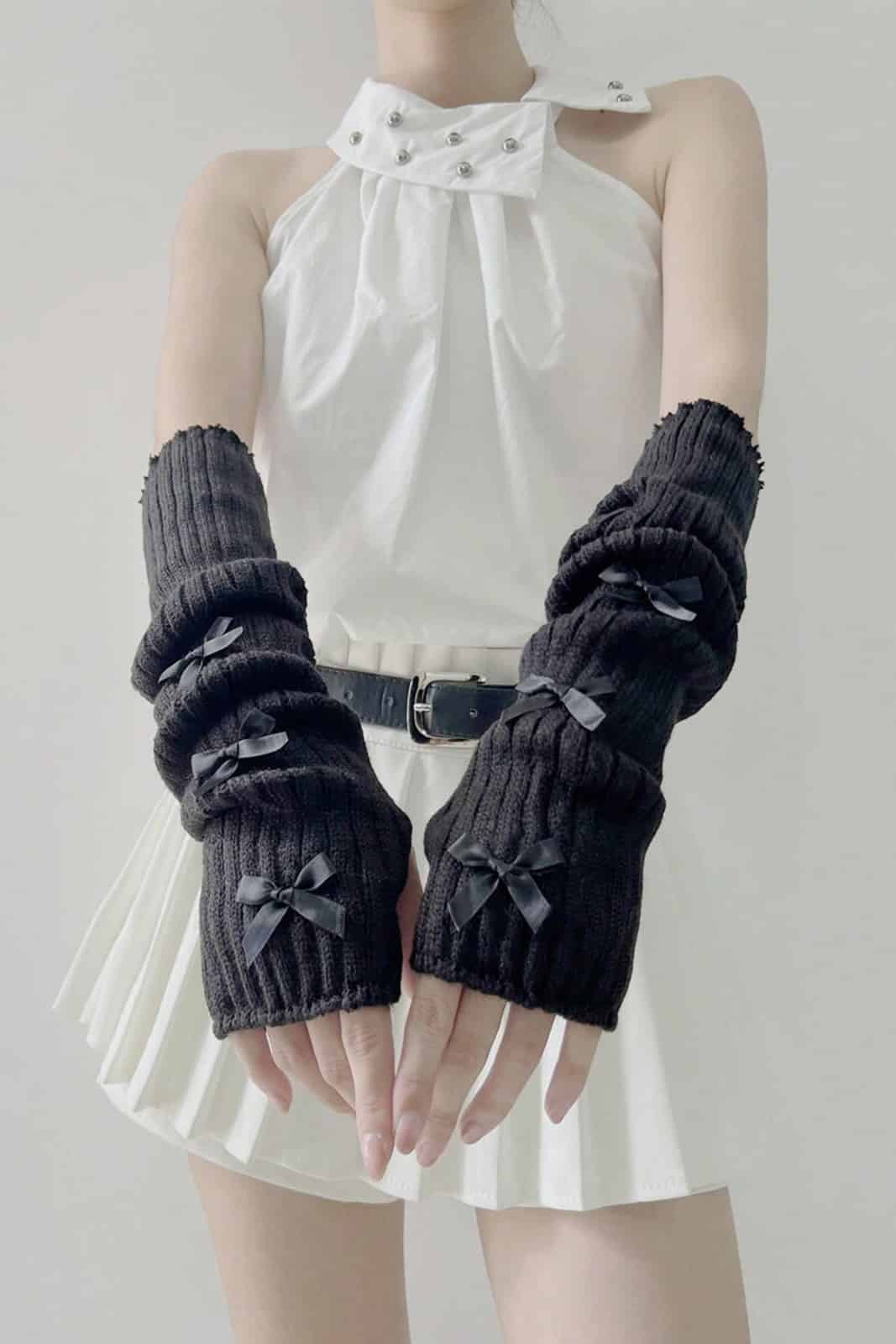 Lange fingerlose Handschuhe mit Daumenloch. Verziert mit süßen Schleifen.