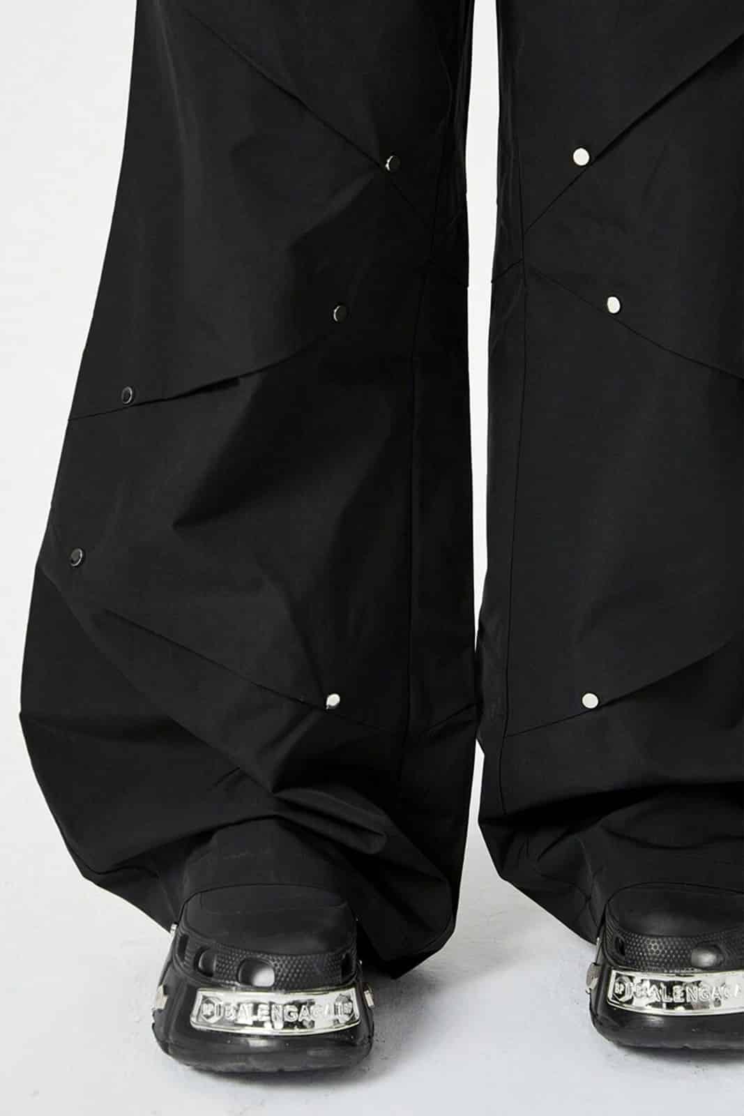 Weit geschnittene Hose mit breitem Bein, Gürtelschlaufen, Knopf und Reißverschluß. Der feste Stoff ist im Beinverlauf mehrmals abgesteppt und mit silbernen Nieten verziert. Hinten mit etwas dehnbarem Hosenbund.