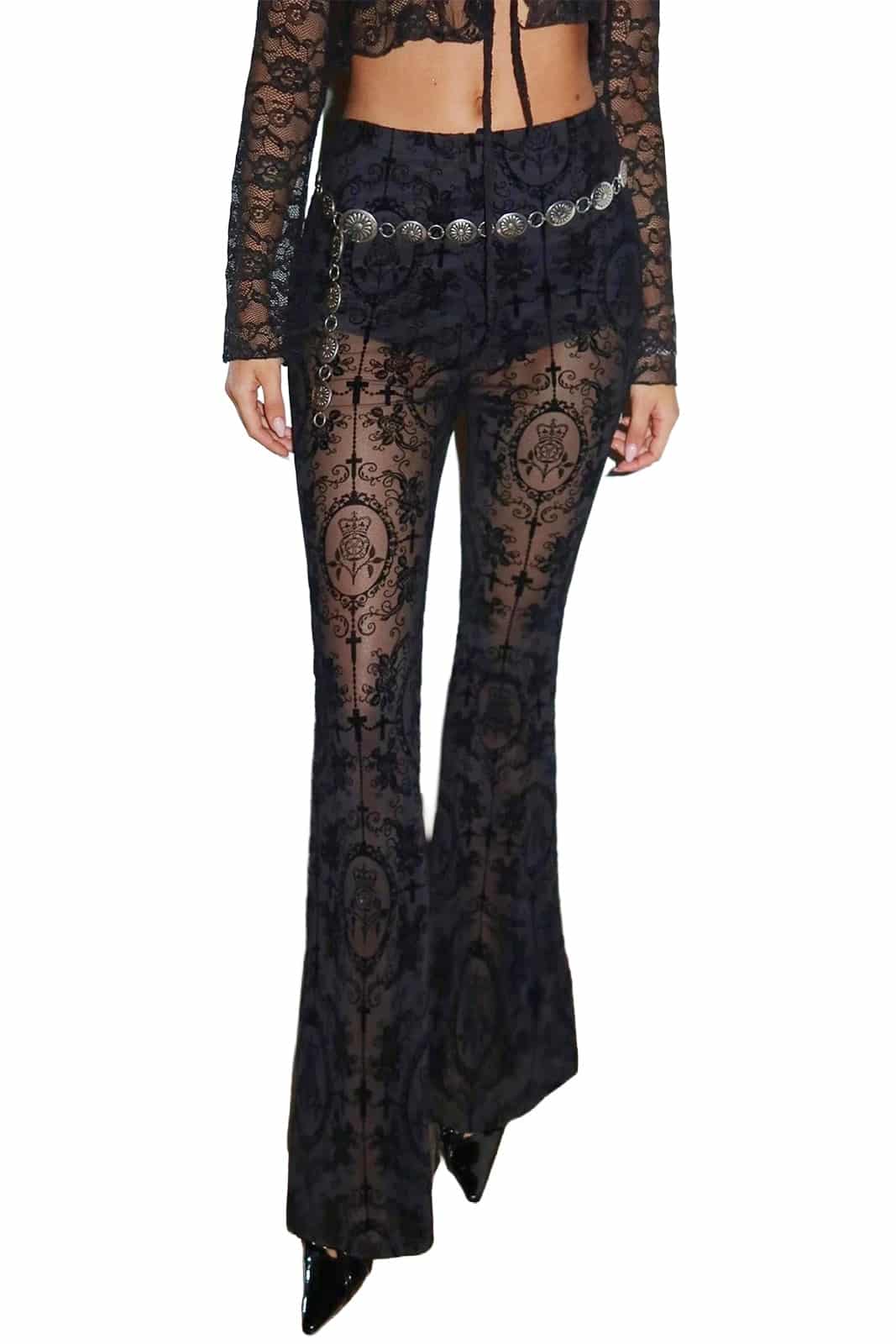 Diese transparente Schlaghose verbindet dunkle Eleganz mit einem mystischen Gothic-Look. Der feine Meshstoff ist mit ornamentalen Motiven aus Kreuzen und viktorianisch anmutenden Emblemen verziert und sorgt für eine geheimnisvolle, fast sakrale Ausstrahlung. Die ausgestellte Form der Beine verleiht der Hose eine fließende Silhouette und macht sie zum perfekten Statement-Piece für Dark Fashion, Festivals oder besondere Abendlooks.