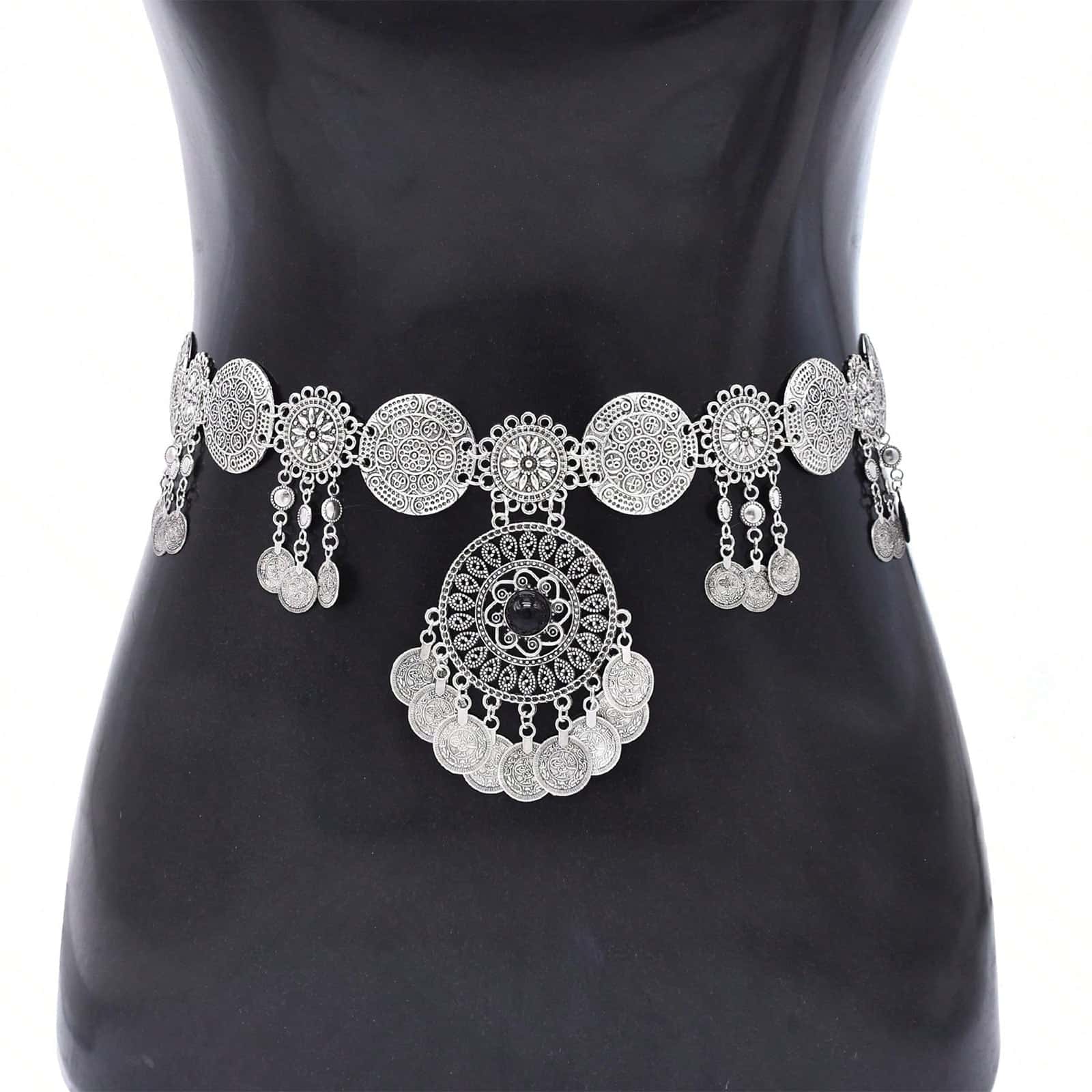 Mystisch anmutende Hüftkette im detaillierten Ornamentdesign, akzentuiert durch dunkle Schmucksteine und ein großes zentrales Medaillon. Die fein gearbeiteten Münzanhänger und seitlich fallenden Ketten erzeugen bei jeder Bewegung ein sanftes, rituelles Klingen und verleihen der Silhouette einen eleganten, boho-orientalischen Touch. Perfekt als markantes Accessoire über Kleidern, Röcken oder Festival-Outfits.