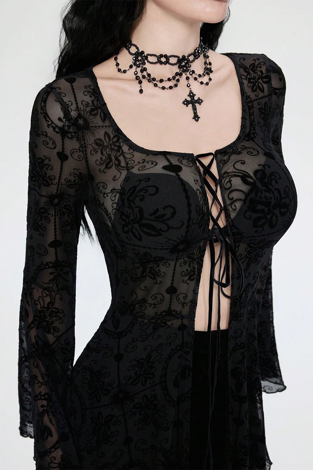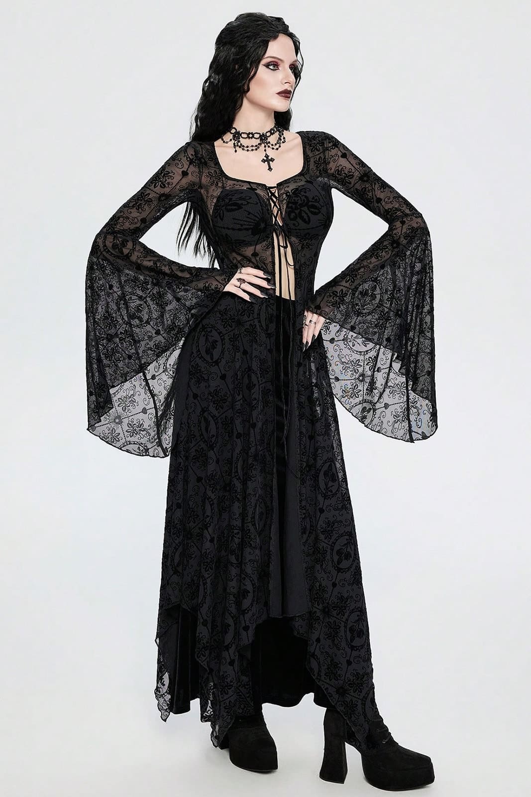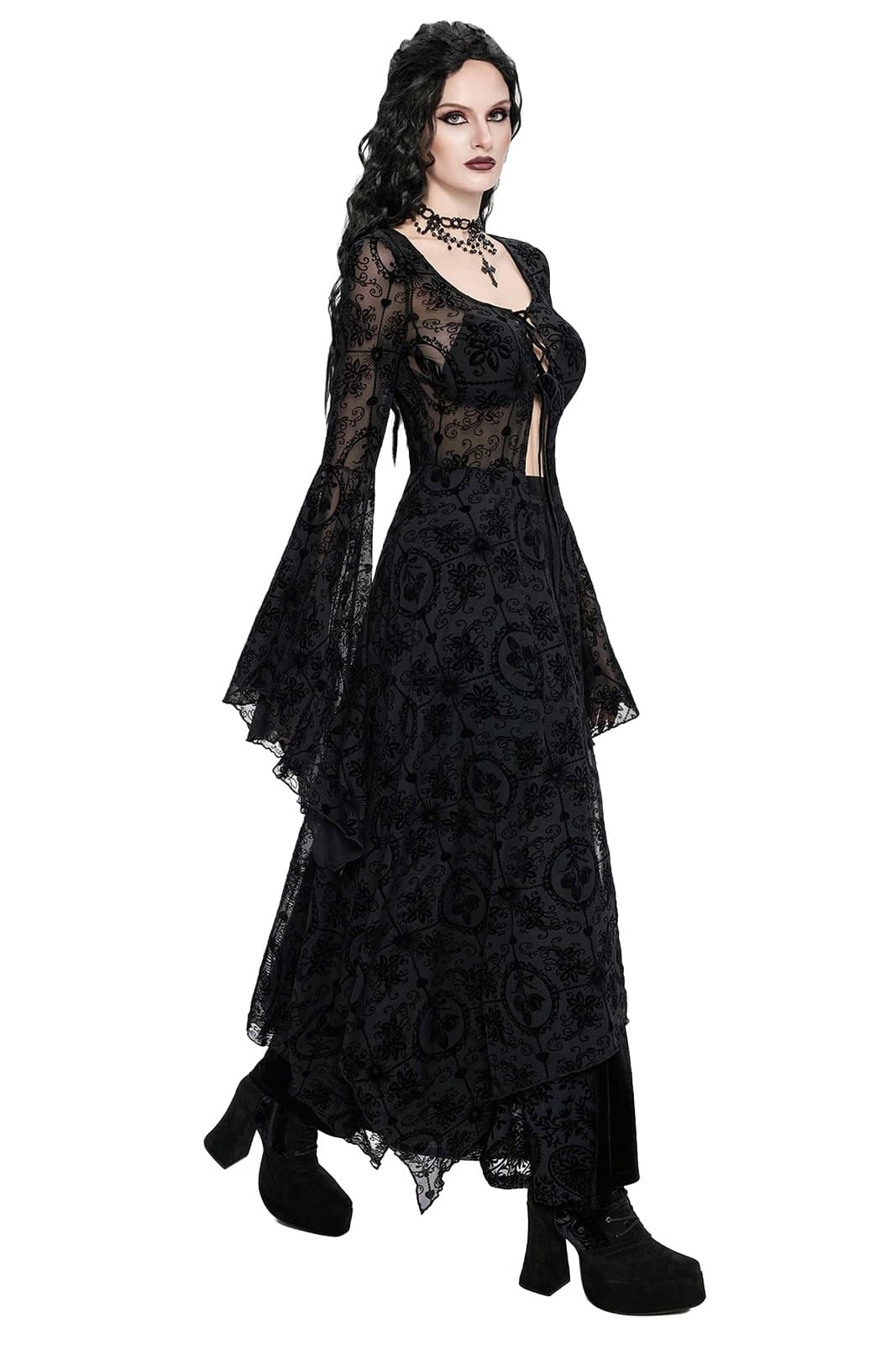 Ein eindrucksvolles, transparentes Kleid mit dunkler Eleganz und fließender Silhouette. Das fein gemusterte Netzmaterial legt sich leicht über den Körper und erzeugt eine geheimnisvolle Tiefe aus Ornamentik und Transparenz. Die Schnürung im Brustbereich setzt einen markanten Akzent, während die weit ausgestellten Ärmel dem Design eine rituelle, beinahe dramatische Anmutung verleihen. Ein Statement-Piece für besondere Anlässe, Konzerte oder konsequent durchdachte Gothic-Looks.