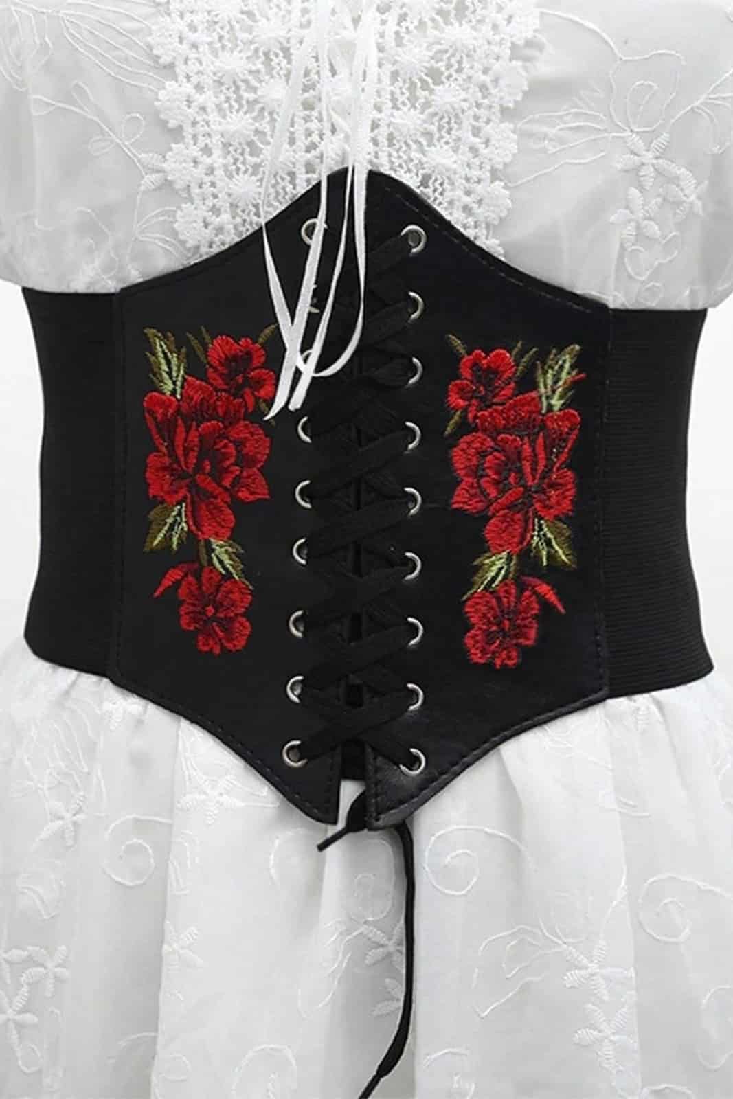 Ausdrucksstarker Miedergürtel mit schwarzer Kunstleder-Front und aufwendig gestickten roten Rosen. Die klassische Schnürung betont die Taille, während die elastische Rückseite aus Polyester mit praktischem Druckknopfverschluss für angenehmen Tragekomfort sorgt. Perfekt als markanter Akzent zu Kleidern, Blusen oder Gothic-Outfits.