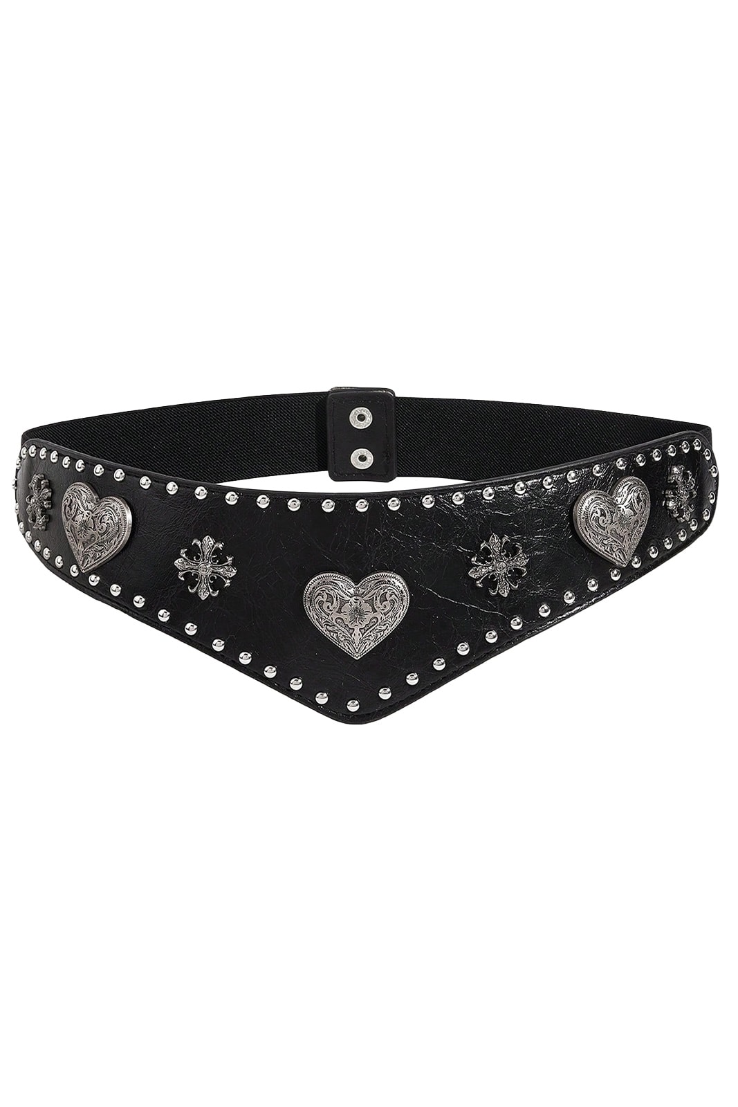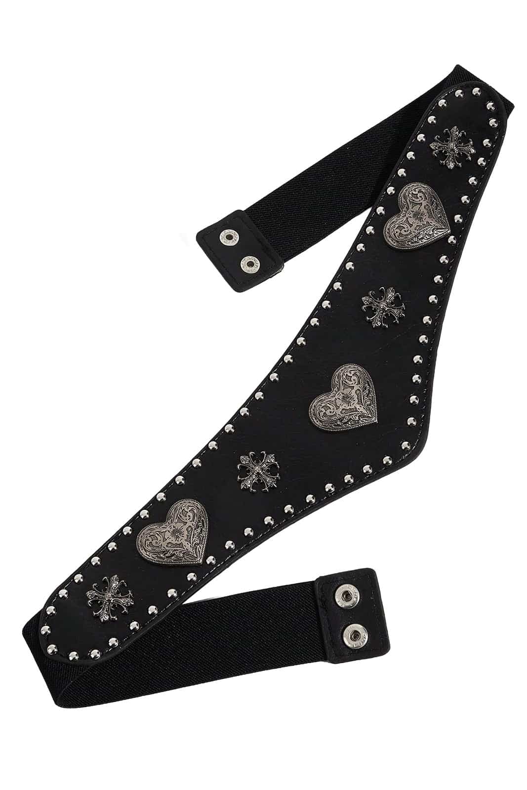 Ein ausdrucksstarkes Statement zwischen Romantik und Rebellion: Dieser Miedergürtel vereint geprägtes Kunstleder mit detailreichen Herz- und Kreuzornamenten sowie dekorativen Nieten. Die geschwungene Form betont die Taille, während der elastische Einsatz im Rücken für einen angenehmen Sitz sorgt – perfekt für markante Gothic- und Alternative-Looks.