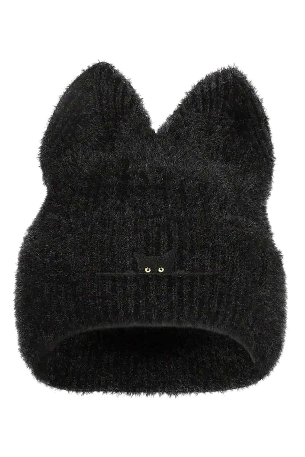Kuschelig weiche Strickmütze mit niedlichen Katzenohren und einer kleinen, gestickten Katze, die vorne neugierig hervorschaut. Das flauschige Material hält angenehm warm und sorgt für einen verspielten, gleichzeitig stylischen Winterlook.