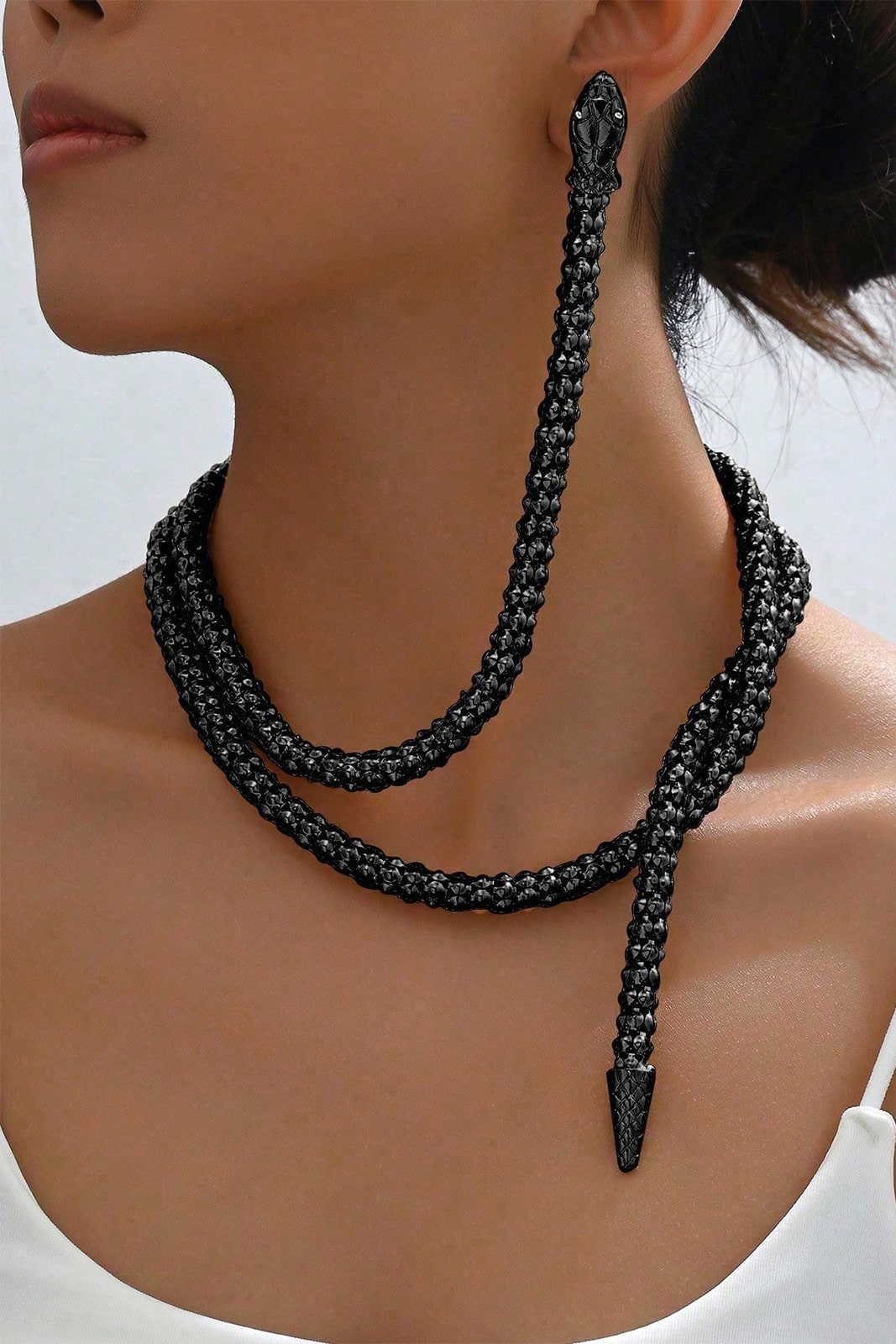 Dramatische Ohrring-Kettenkombi im Stil einer geschwungenen Nachtschlange, inspiriert von der geheimnisvollen Vipera berus. Die strukturierte, schuppenartige Oberfläche und die flexiblen, lang fallenden Stränge erzeugen den Eindruck einer anmutig gleitenden Schlange, die sich elegant um Hals und Schulter legt. Ein extravagantes Statement-Piece für mutige Looks – sinnlich, dunkel und absolut unverwechselbar.
