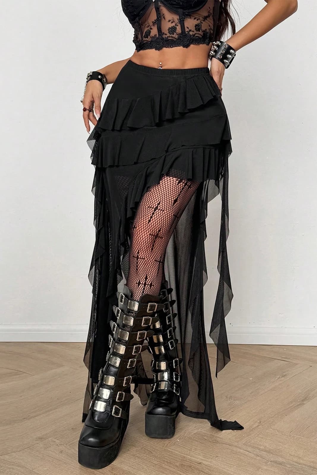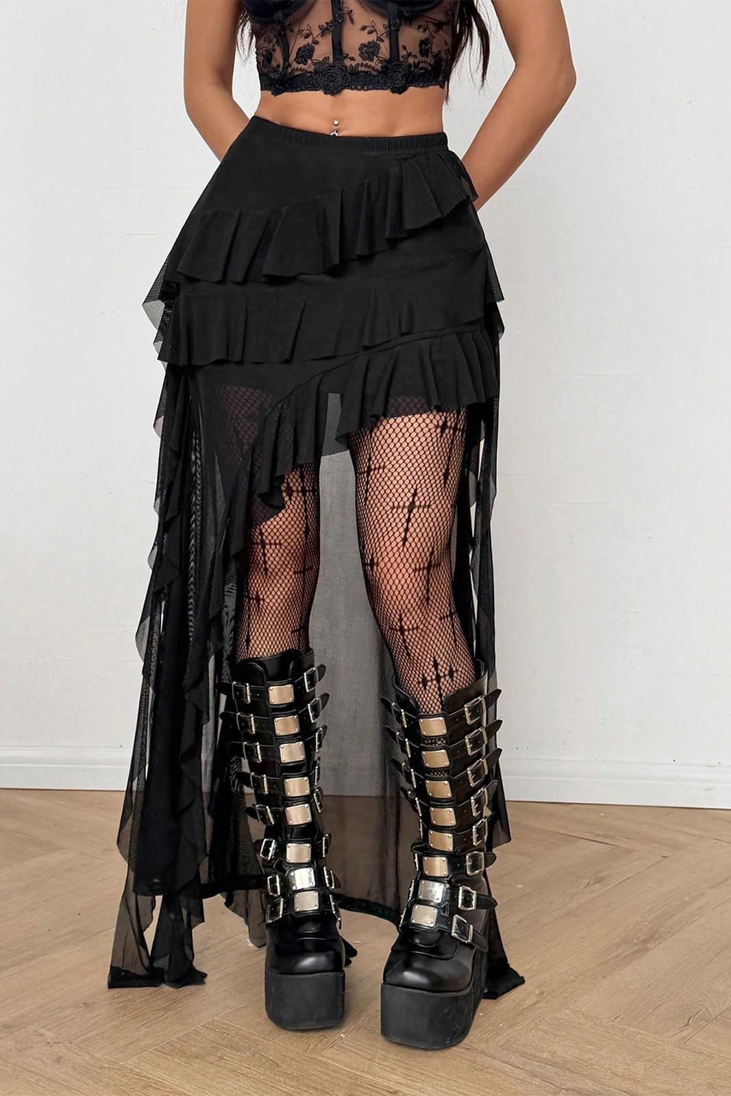 Dramatisch, fließend und voller Bewegung – der Dark Tempest Layers Rock verbindet figurbetonte Passform mit verspielten Rüschen und transparenten Elementen. Die asymmetrische Silhouette sorgt für einen spannenden Fall, während die leichten Mesh-Lagen bei jedem Schritt Dynamik erzeugen. Perfekt für ausdrucksstarke Gothic- und Festival-Looks.