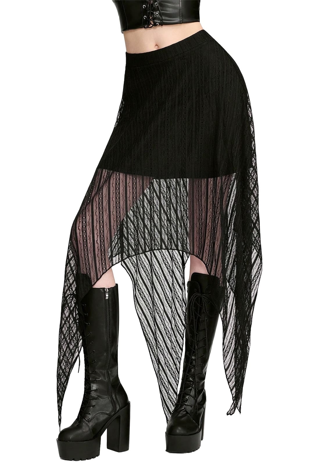 Leicht wie ein dunkler Schleier und voller mystischer Eleganz – der Nocturna Sacra Rock spielt mit Transparenz und fließenden Linien. Die feine Spitze und der asymmetrische Saum verleihen deinem Look eine geheimnisvolle, fast zeremonielle Ausstrahlung.