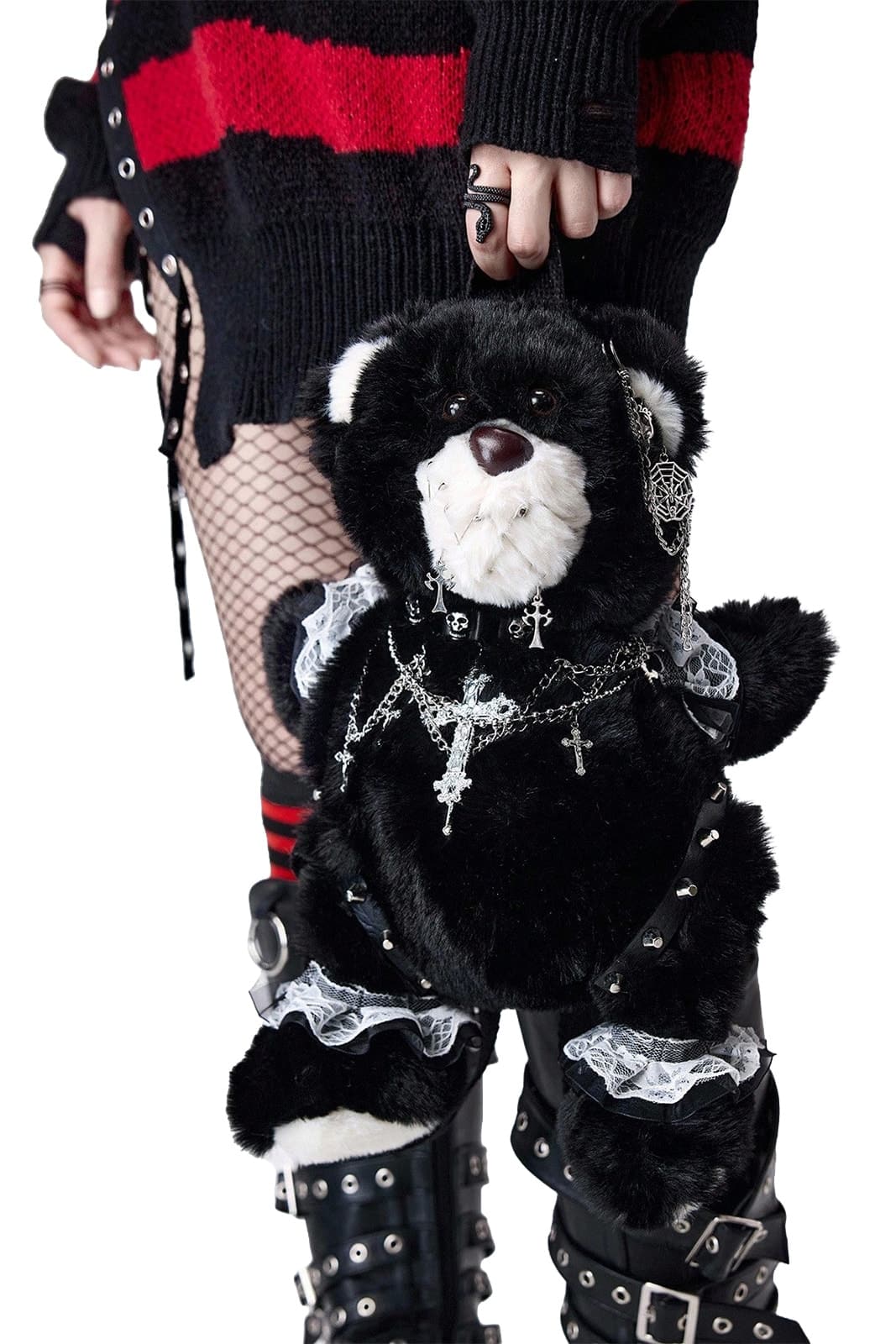 Außergewöhnlicher Gothic-Rucksack in Form eines schwarzen Teddybären, gefertigt aus weichem Polyacryl. Verziert mit Ketten, Kreuzen, Nieten und feinen Spitzenakzenten verbindet dieses Design morbiden Charme mit verspielter Dunkelästhetik. Die kontrastierenden weißen Details im Gesicht setzen einen starken visuellen Akzent, während der kompakte Stauraum Platz für Essentials bietet. Ein auffälliges Statement-Piece für Gothic-, Alternative- und Dark-Fashion-Looks.