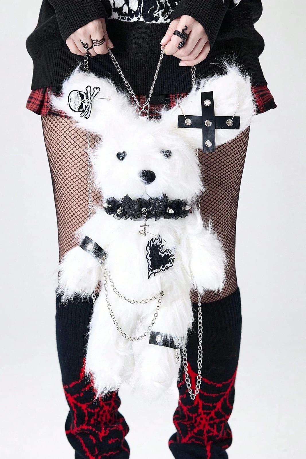Ein außergewöhnlicher Plüsch-Rucksack im Gothic-Cute-Stil: Die große weiße Fellfigur mit Nieten, Kreuzdetails, Spitze und Metallketten zieht alle Blicke auf sich und wird wie ein stylischer Begleiter am Rücken getragen. Trotz der imposanten Optik ist das Innenfach bewusst klein gehalten – ideal für Handy, Schlüssel oder kleine Essentials. Perfekt für alle, die ein Statement-Accessoire mit düsterem Charme suchen.