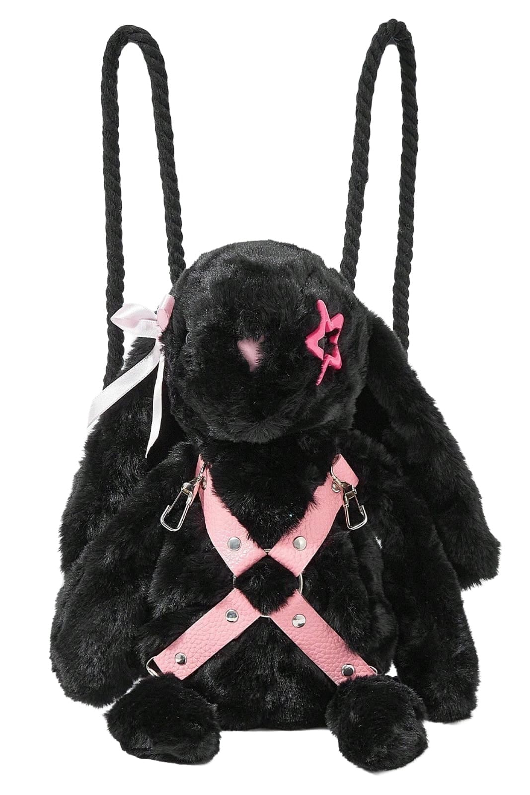 Dieser flauschige Bunny-Rucksack verbindet verspielten Kawaii-Charme mit einem frechen Dark-Style. Der weiche schwarze Plüsch, die langen Hasenohren und das rosa Harness-Detail machen ihn zu einem auffälligen Statement-Accessoire für alternative Looks. Kleine Details wie Schleife, Stern-Applikation und dekorative Metallbeschläge verleihen dem Rucksack seinen einzigartigen Mad Moonshine Charakter.