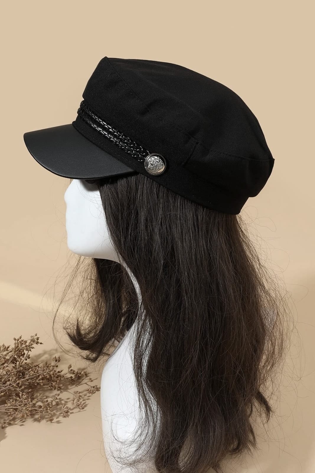 Mütze aus weichem Polyester mit seitlichen geprägten Knöpfen, einem geflochteten Hutband und einem Schild aus Kunstleder. Innen weich gefüttert. Mit einem verstellbaren Band im Innern zum Anpassen an den Kopfumfang.