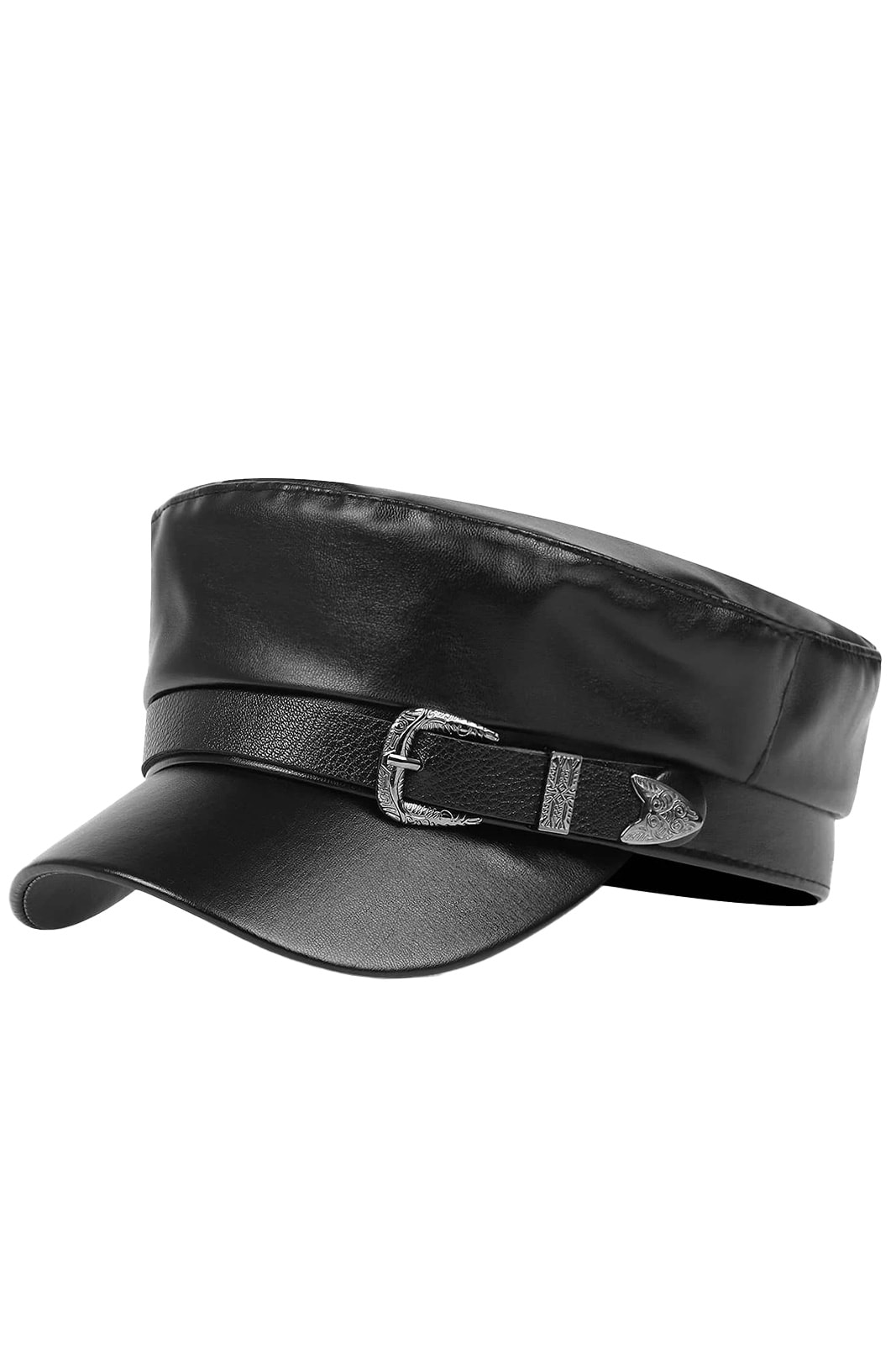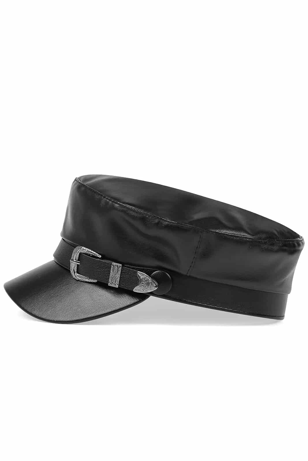 Schildmütze aus hochwertigem Kunstleder mit Innenfutter aus Polyester. Verziert mit einer geprägten Schnalle an der Seite.