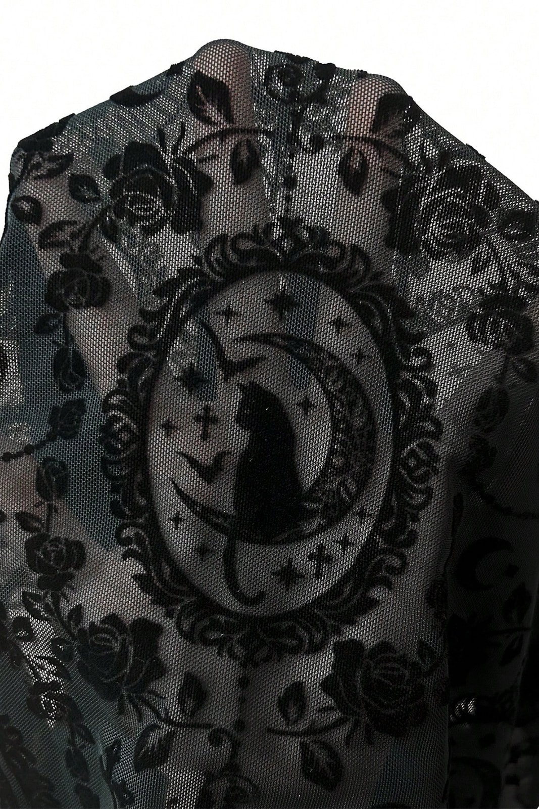 Diese transparente Gothic-Schlaghose vereint mystische Symbolik mit einer dramatischen Silhouette. Der feine Meshstoff ist mit samtigen Ornamenten aus Monden, Rosen, Kreuzen und einer geheimnisvollen Katze verziert und verleiht der Hose eine okkulte, nächtliche Ausstrahlung. Die figurbetonte Form geht ab dem Knie in einen ausladenden Schlag über und sorgt für eine elegante, fließende Bewegung. Durch den halbtransparenten Stoff entsteht ein faszinierender Layer-Look – perfekt für Dark Fashion, Festivals oder Clubnächte.