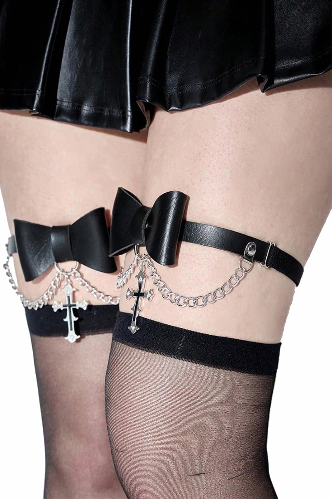 Elegantes Gothic-Strumpfhalter-Set mit schmalen Riemen, dekorativen Schleifen und feinen Kettenelementen. Die herabhängenden Kreuze setzen einen klaren occult Akzent und verleihen dem Design eine dunkle, fast sakrale Anmutung. In klassischem Schwarz gehalten, ideal als stilvolles Statement zu Röcken, Kleidern oder Lingerie-Looks im Gothic- und Dark-Romance-Stil.