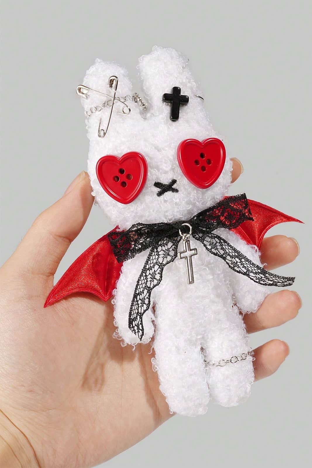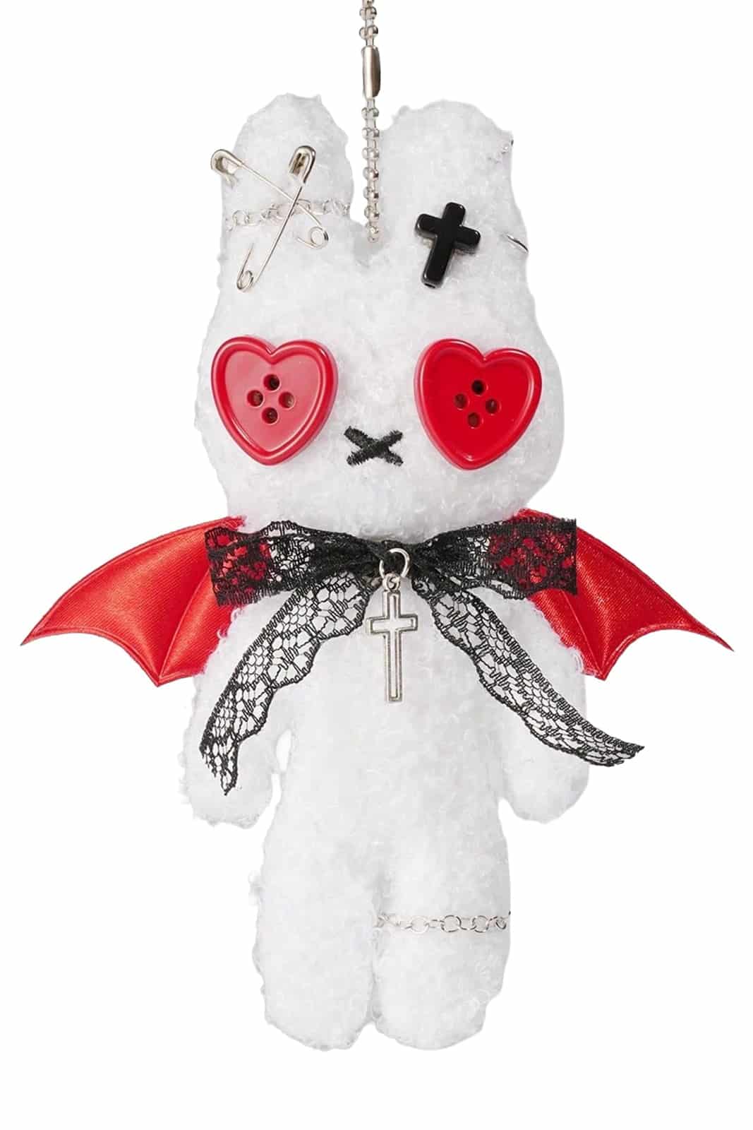 Dieser außergewöhnliche Taschenanhänger verbindet niedliche Optik mit düsterem Gothic-Flair. Der weiße Plüschhase wird durch rote herzförmige Knopfaugen, Sicherheitsnadel-Details, schwarze Kreuzapplikationen und kleine rote Fledermausflügel zum markanten Statement-Piece. Abgerundet wird das Design durch eine schwarze Spitzen-Schleife mit Kreuzanhänger und feine Metallketten. Mit seinen Abmessungen von ca. 17 x 8 cm ist der Anhänger ideal als Blickfang an Tasche, Rucksack oder Schlüsselbund und verleiht jedem Look eine verspielte, okkulte Note.
