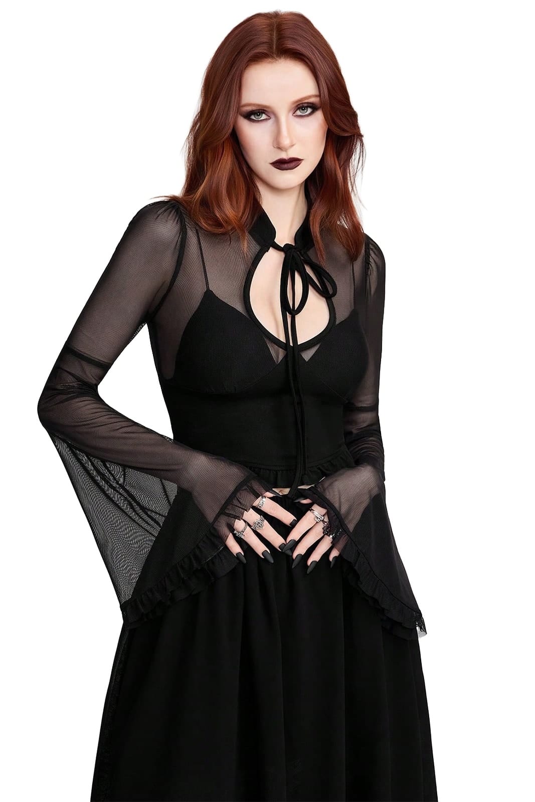 Ein zartes, geheimnisvolles Mesh-Top mit verführerischer Ausstrahlung: Der transparente Stoff legt sich wie ein dunkler Schleier um die Silhouette, während die Schnürung am Halsausschnitt dem Look eine magisch-romantische Note verleiht. Die fließenden Trompetenärmel sorgen für dramatische Bewegung und unterstreichen den mystischen Hexen-Charakter dieses Pieces.