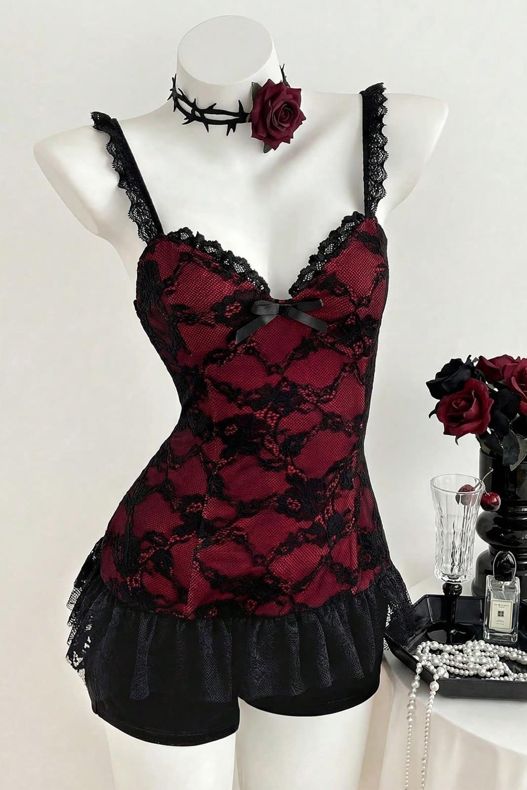Ein verführerisches Trägertop im romantisch-düsteren Stil: Die Kombination aus tiefem Rot und filigraner schwarzer Spitze sorgt für eine sinnliche, elegante Ausstrahlung. Zarte Rüschen am Ausschnitt und die kleine Schleife setzen verspielte Akzente und verleihen dem Look eine feminine, leicht viktorianische Note – perfekt für besondere Abende oder als Highlight im Gothic-Alltag.