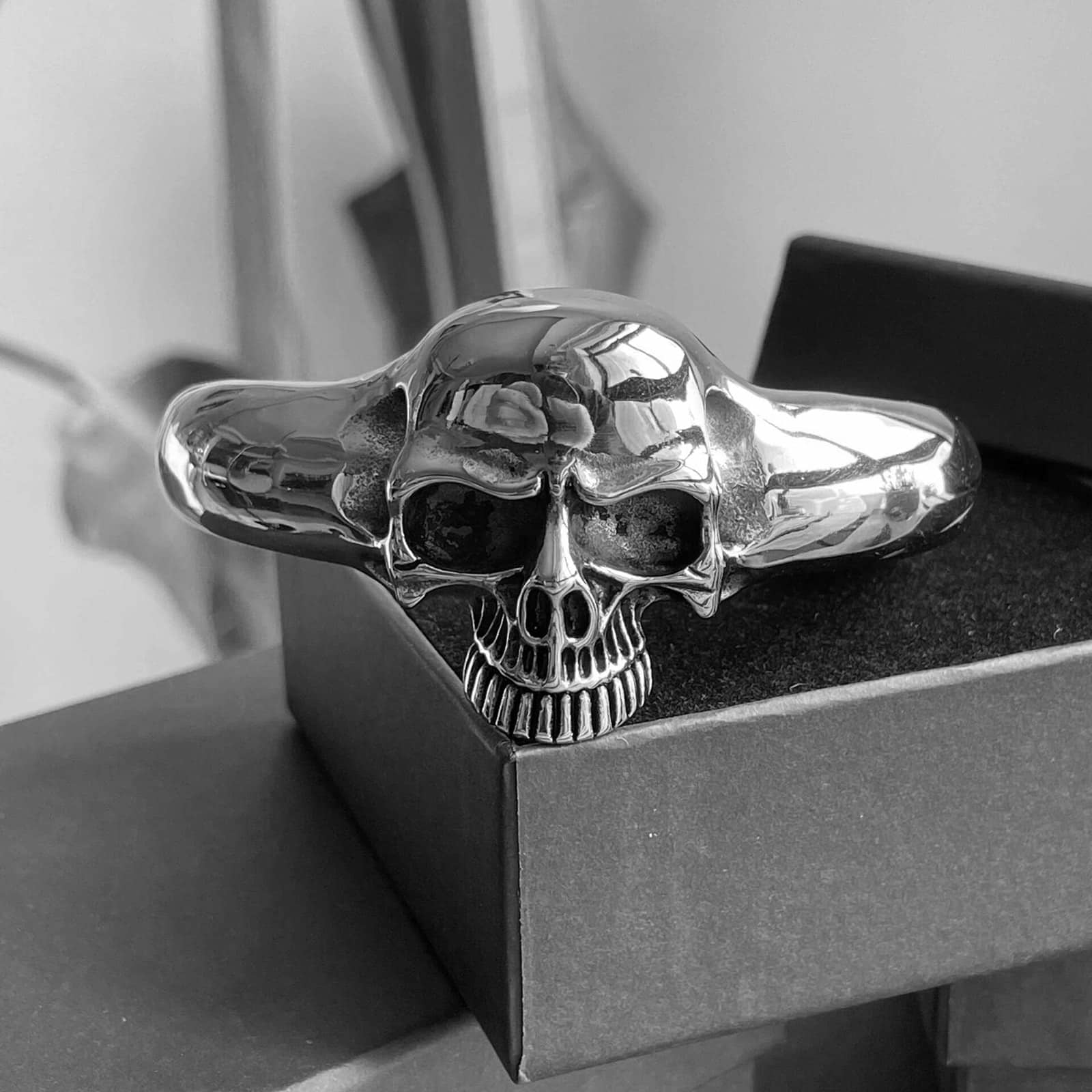 Armreif aus rostfreiem Edelstahl in Form eines großen Totenschädels.