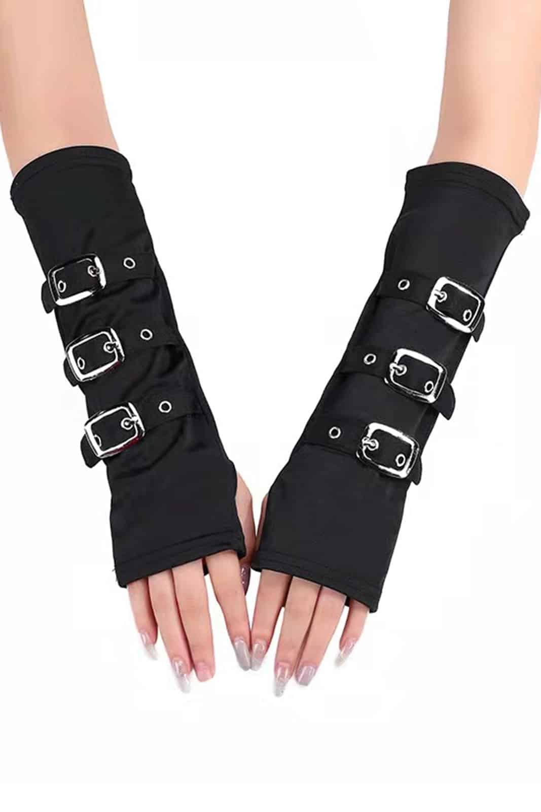 Lange, fingerlose Armstulpen mit Daumenloch und Schnallen.