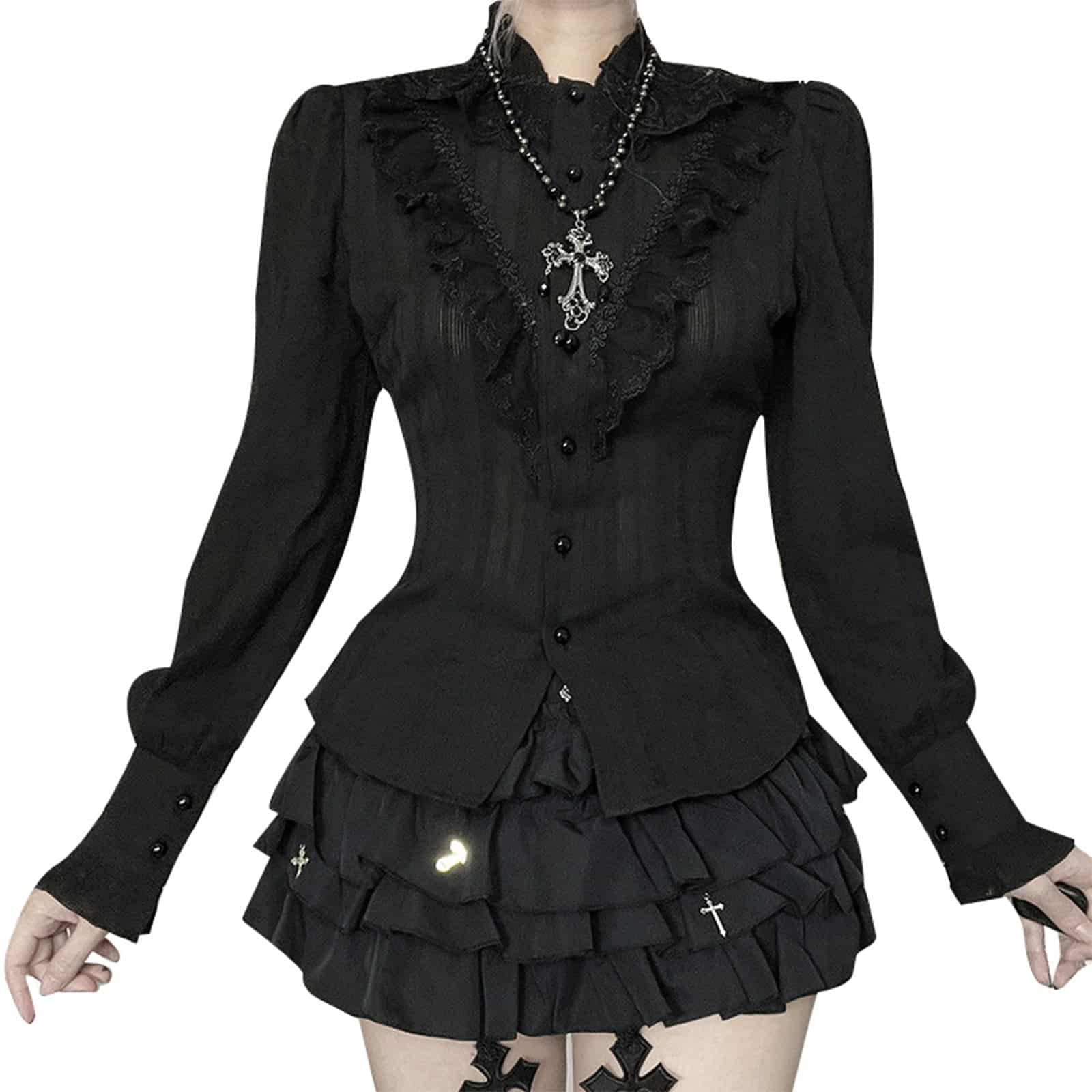 Elegante schwarze Gothic-Bluse mit taillierter, viktorianisch inspirierten Silhouette und markanter Rückenschnürung für eine individuell anpassbare Form. Die Vorderseite besticht durch eine reich verzierte Rüschenpartie, feine Strukturstreifen und edle Knöpfe. Puffige Schultern, ein hoher Spitzkragen und die langen Manschettenärmel verleihen dem Design einen dramatisch-romantischen Charakter – perfekt für klassische Dark-Fashion- und Vintage-Goth-Outfits.
