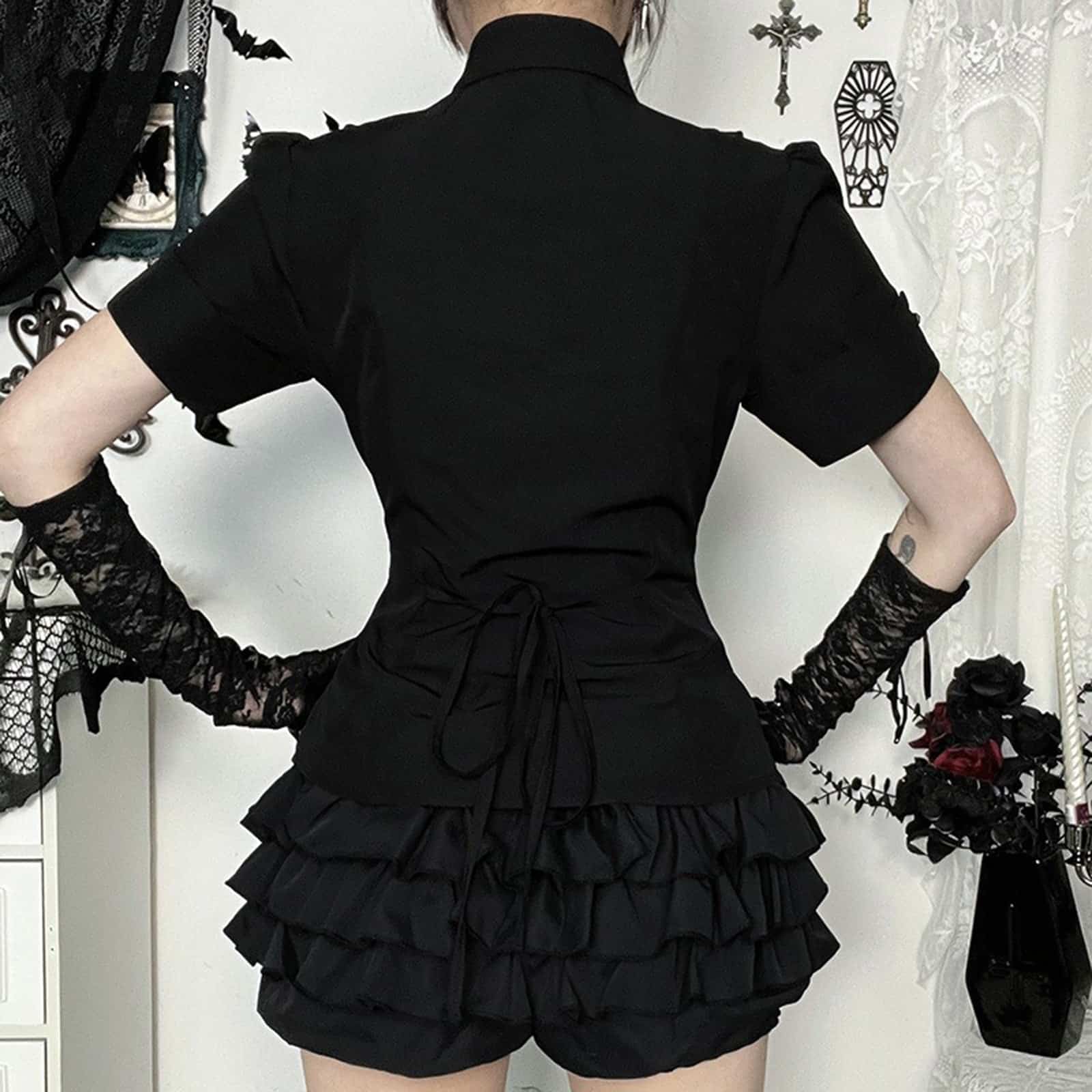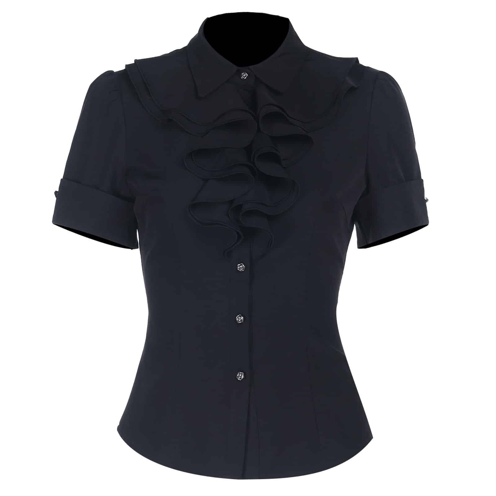 Die Noir Echo Bluse vereint klassische Eleganz mit einem Hauch düsterer Romantik. Gefertigt aus einem hochwertigen, leicht glänzenden Stoff betont sie durch ihre taillierte Passform die Silhouette auf besonders schmeichelhafte Weise. Der markante Rüschenbesatz entlang der Knopfleiste sorgt für ein verspieltes, viktorianisch inspiriertes Detail, das dem Gesamtlook Tiefe und Ausdruck verleiht. Die kurzen Puffärmel unterstreichen den femininen Charakter, während der Kragen in Hemdform für eine stilvolle Struktur sorgt. Ob als Kontrast zu verspielten Röcken oder als Statement-Piece in einem dunklen Ensemble – diese Bluse ist ein stilvolles Basic für jede Gothic- oder Elegance-Lover-Garderobe.