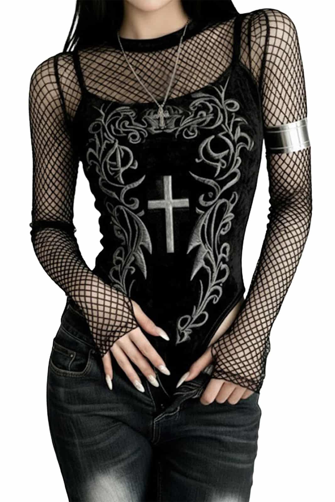 Sinnlich und kontrastreich: Dieser Body kombiniert feines, transparentes Netz mit weichem Samt und schafft so einen eleganten Gothic-Look mit besonderer Tiefe. Die langen Ärmel mit Daumenlöchern sorgen für einen modernen, leicht edgy Touch, während der samtige Rundhalsausschnitt das Design stilvoll abrundet.