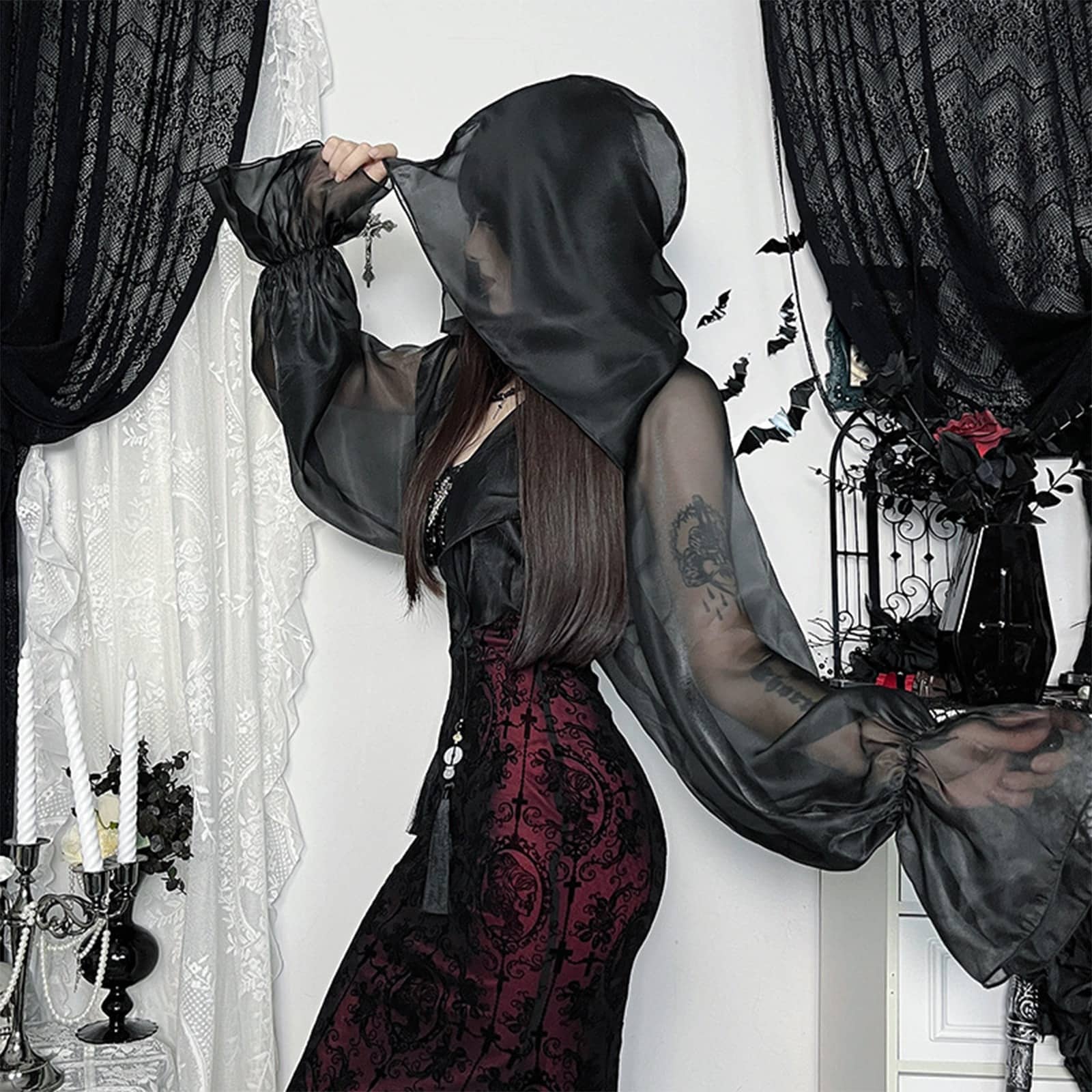 Zarter Gothic-Bolero aus transparenter schwarzer Chiffonoptik mit dramatisch weit ausgestellten Ärmeln und einer großzügigen, mystisch fallenden Kapuze. Die leichte, fließende Struktur verleiht jedem Outfit eine geheimnisvolle, schattenhafte Aura und setzt elegante Akzente über Kleidern oder Tops. Ideal für düstere Abendlooks, Rituale oder stilvolle Dark-Fashion-Inszenierungen.