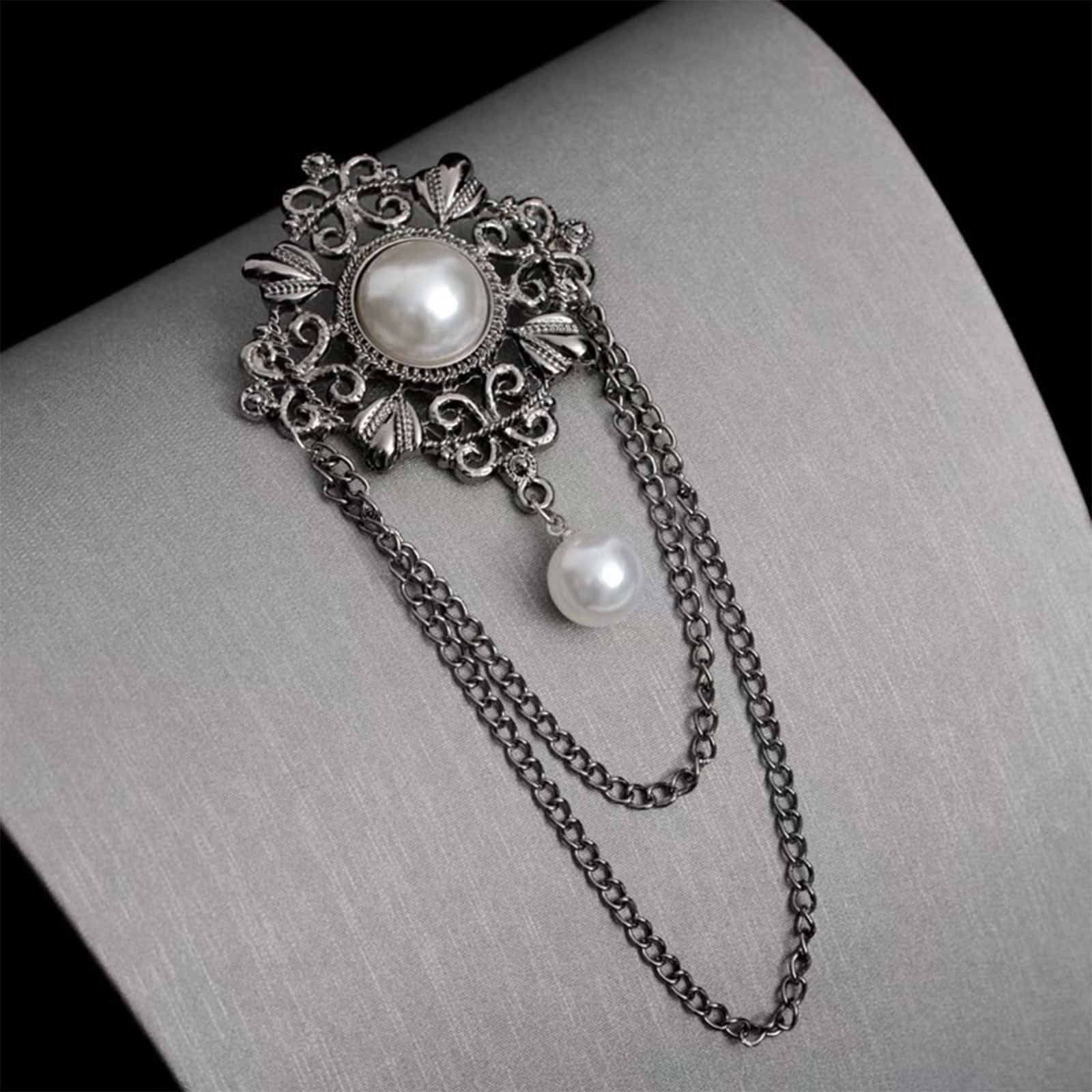 Elegante Brosche im viktorianischen Stil mit kunstvoll verzierten Ornamentdetails und einer zentralen Perlenkugel als Blickfang. Zwei feine Metallketten sowie ein zusätzlicher Perlenanhänger verleihen dem Accessoire eine edle, nostalgische Ausstrahlung. Perfekt als schmückender Akzent an Kleidern, Blusen, Mänteln oder festlichen Outfits – ein zeitloses Statementstück für besondere Anlässe.