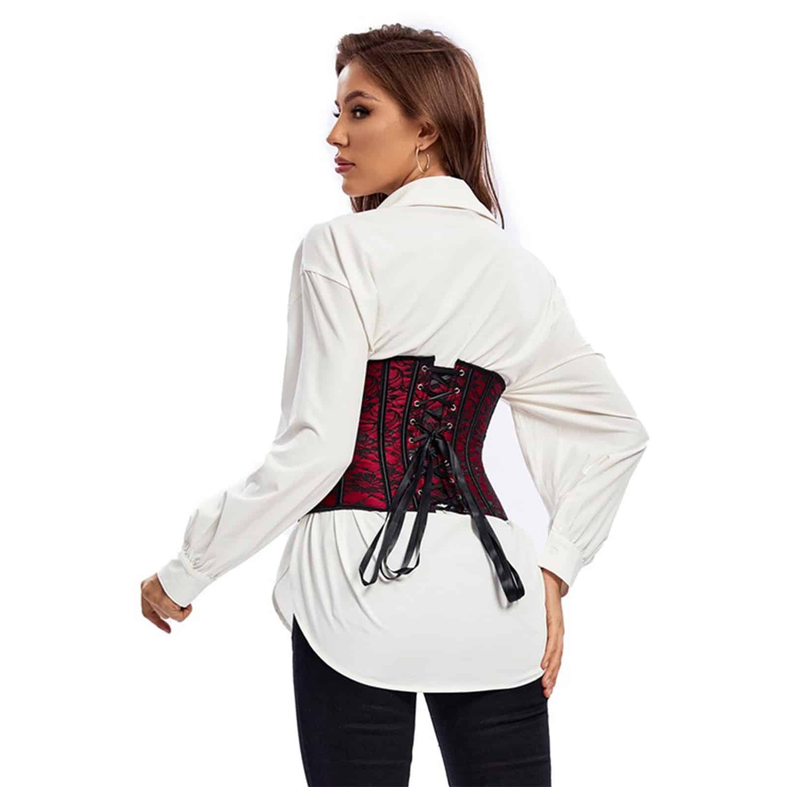 Classic underbust corset with plastic bones, back lacing and hook fastener. The slightly shiny brocade material wears comfortably and attracts attention. Can be combined in many ways.