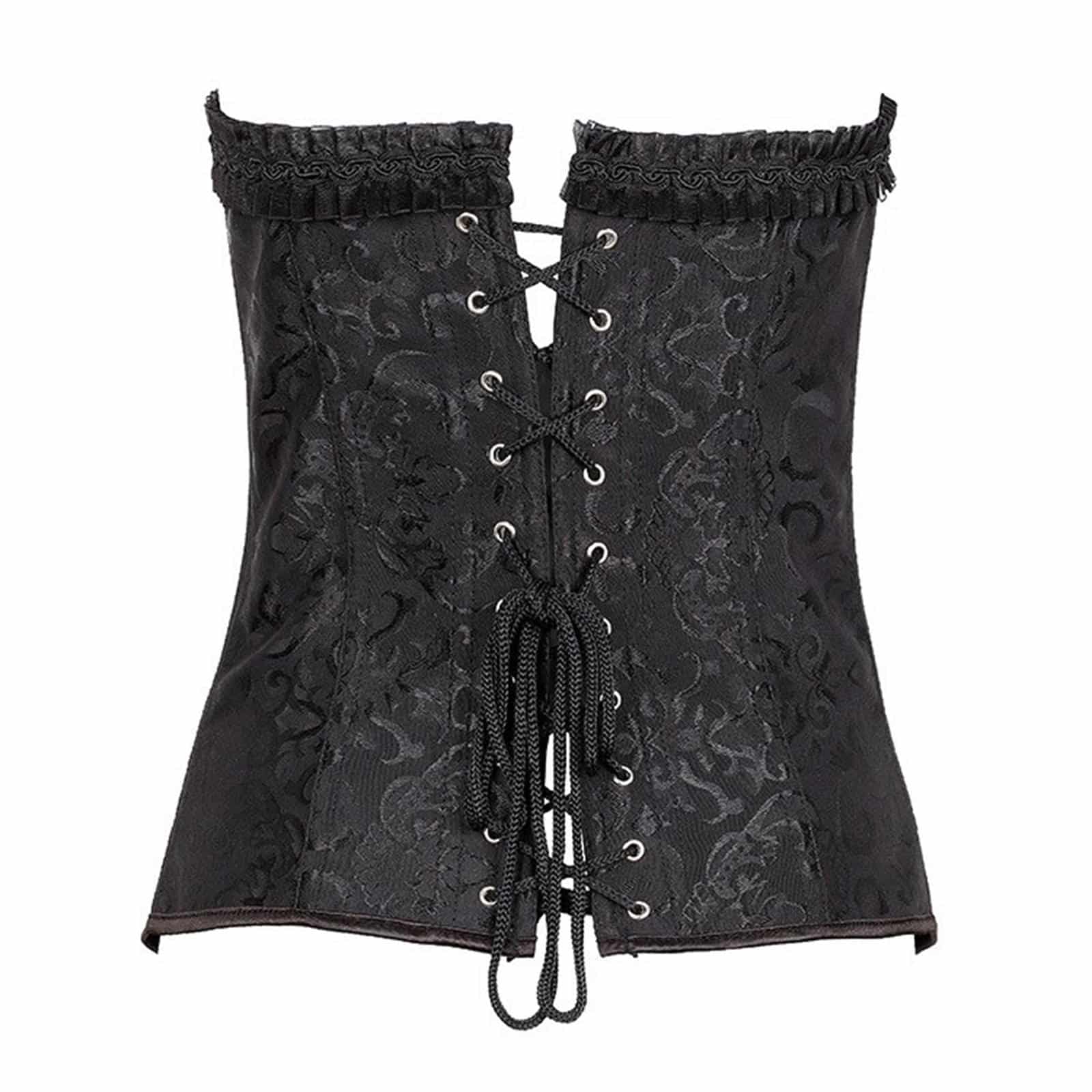 Seductive overbust corset made of beautiful brocade material with plastic stays, back lacing and hook closure. The heart-shaped top hem is decorated with fine lace and delicate ruffles.