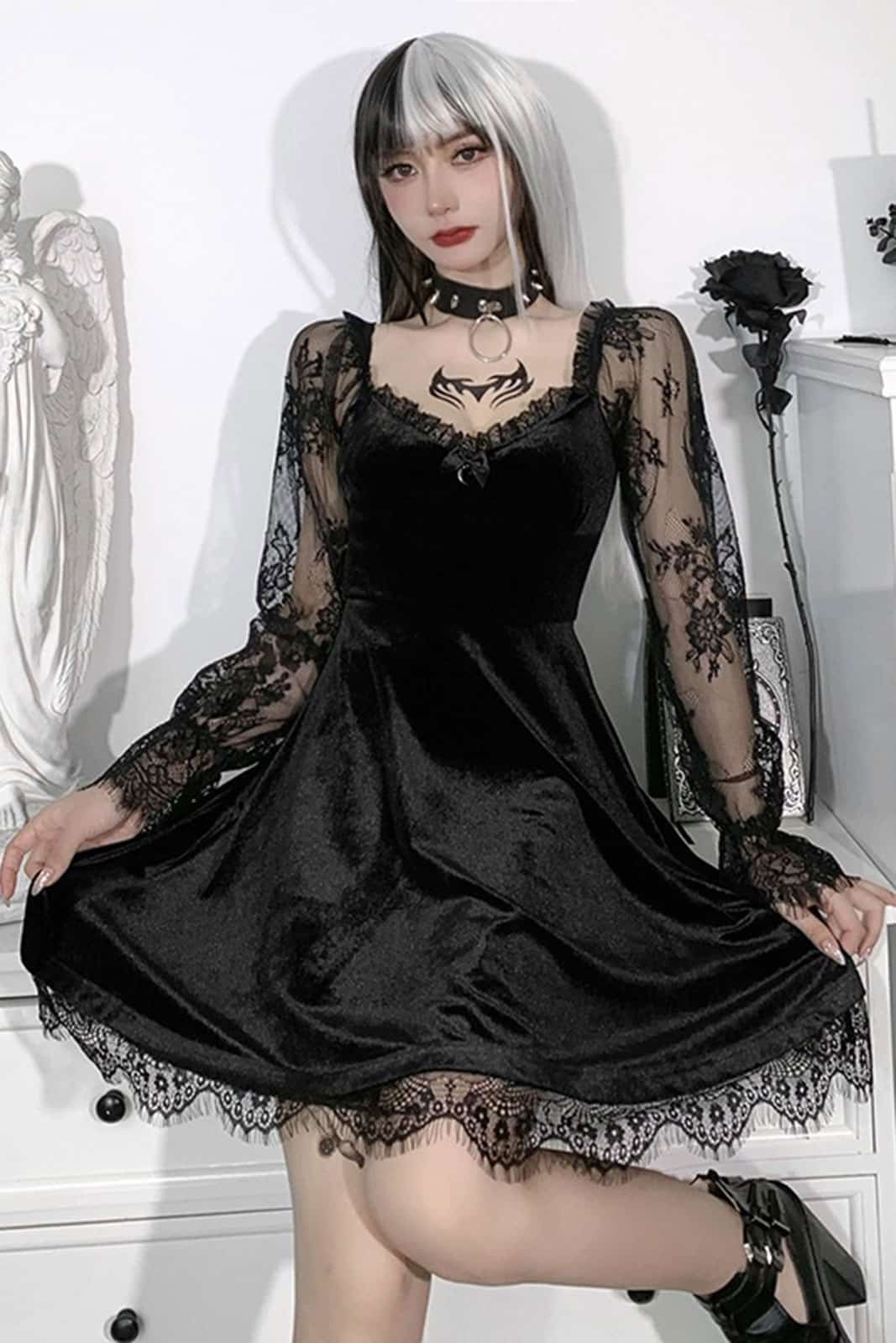 Pale black dress with delicate long lace sleeves and a wide Carmen neckline. The lower hem and neckline are trimmed with beautiful lace. A silver crescent pendant and a small black bow draw the eye magically.