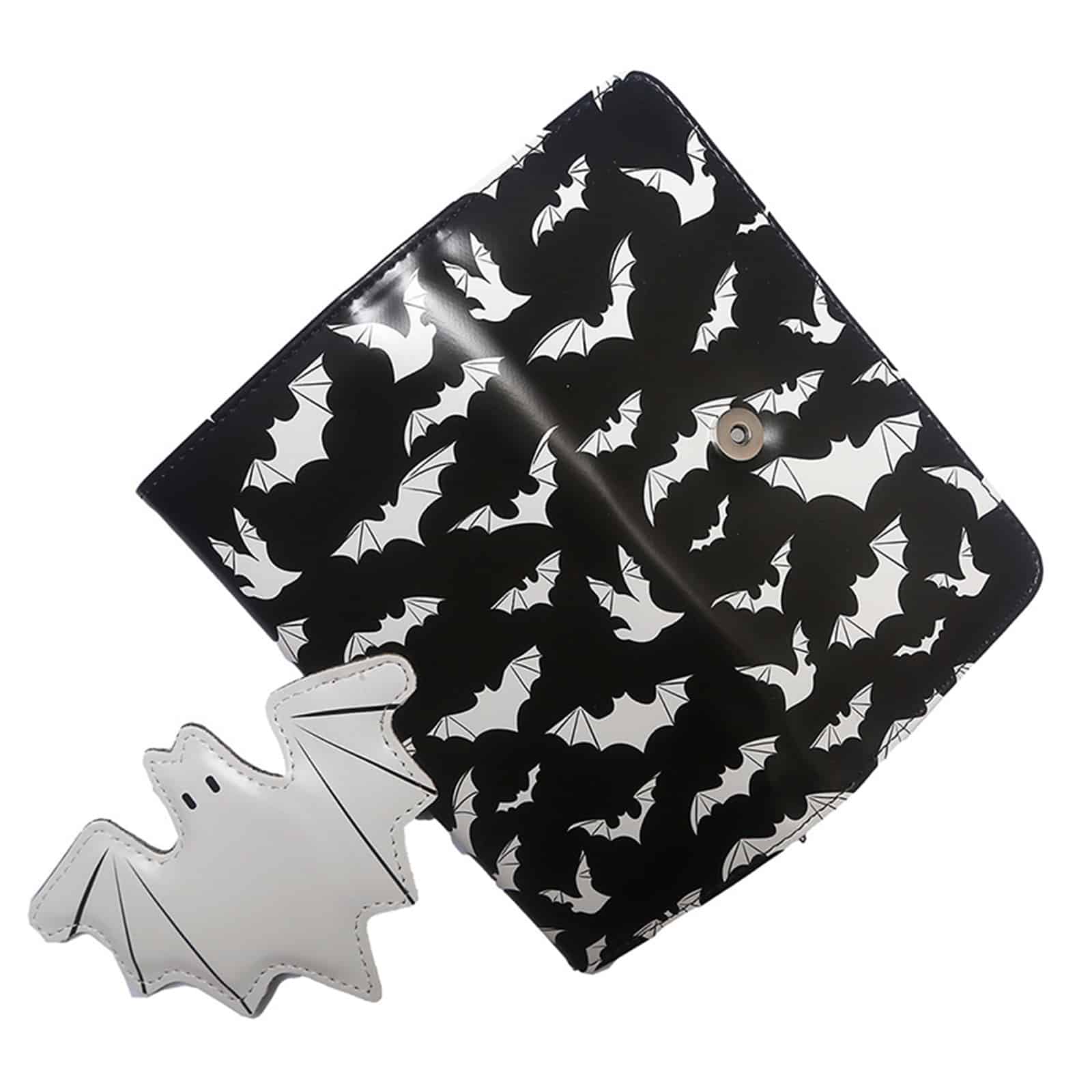 Dunkel, verspielt und absolut gothic – die Nightflight Bat Wallet verbindet praktischen Alltag mit markantem Alternative-Style. Das auffällige Fledermausdesign wird durch eine große weiße Fledermaus ergänzt, die gleichzeitig als Verschlusslasche dient und der Geldbörse ihren unverwechselbaren Look verleiht.