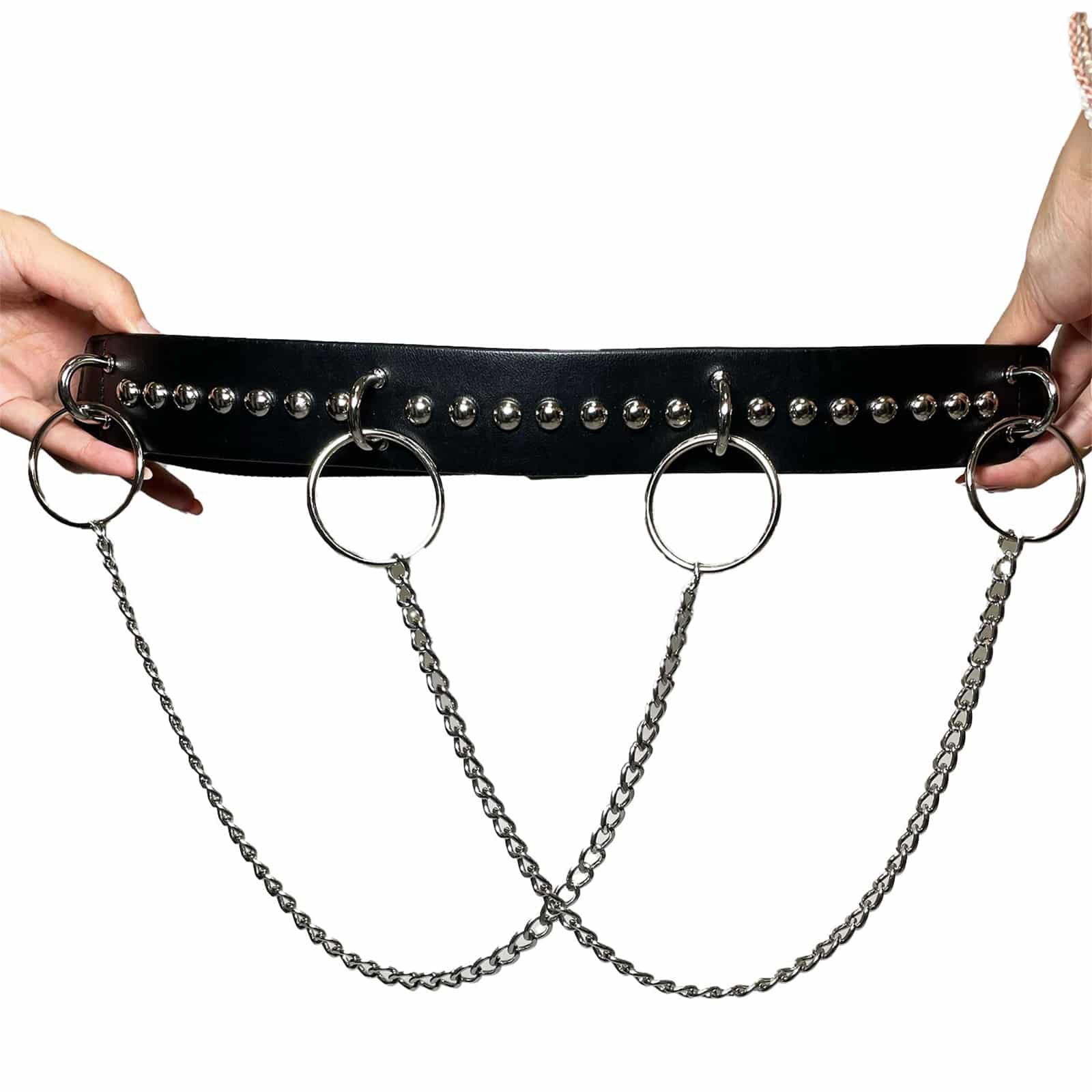 Edler Taillengürtel im Punk-Glam-Stil mit markanter Nietenreihe und vier großen Metallringen, an denen doppelte Zierketten schwingen. Die Vorderseite wirkt strukturiert und kraftvoll, während das elastische Rückenband für eine bequeme, flexible Passform sorgt. Dank praktischem Druckknopfverschluss lässt sich der Gürtel schnell und sicher schließen – perfekt, um Outfits sofort mehr Kante und Dynamik zu verleihen.