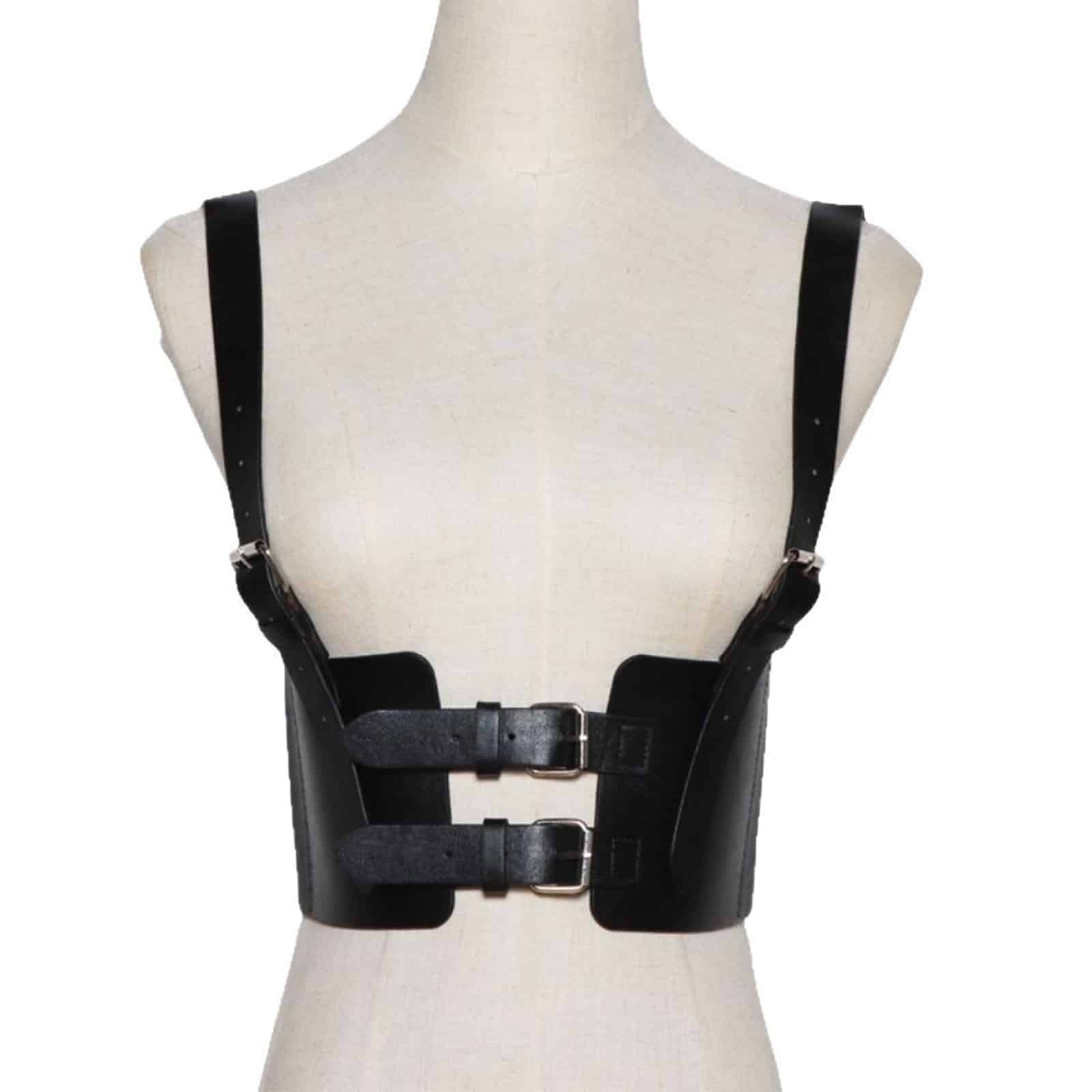 Markanter Harness im modernen Gothic- und Utility-Stil mit zwei breiten Frontriemen und verstellbaren Schultergurten für eine individuell anpassbare Passform. Die stabile Konstruktion betont Oberkörper und Taille, während die Doppelschnallen vorn einen kraftvollen, strukturierten Look erzeugen. Perfekt als auffälliges Layer-Piece über Tops, Kleider oder Bodys – für ein Statement, das sofort Präsenz zeigt.