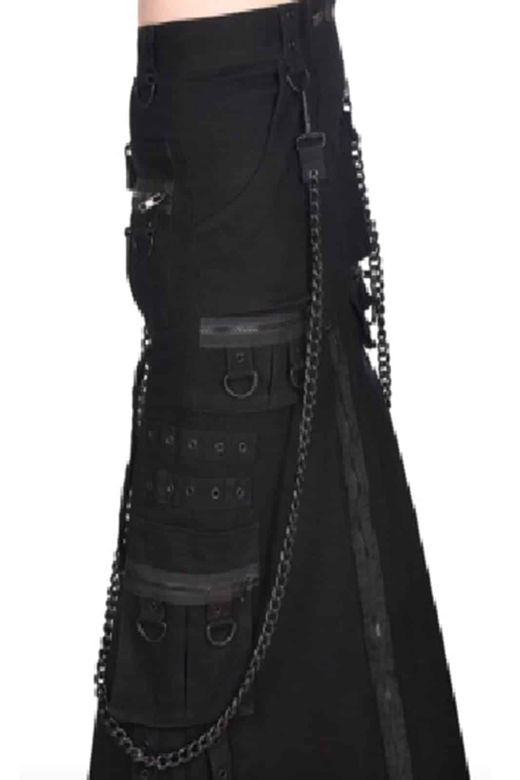Knöchellanger Gothic-Herrenrock aus robuster Baumwolle mit Hosentaschen und Details wie aufgesetzten Taschen, Gürtelschlaufen, Riemen, Ösen und Ketten. Komplett in schwarz gehalten.