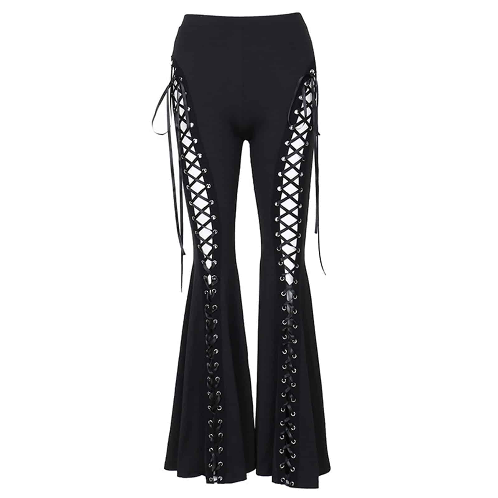 Diese auffällige Gothic-Hose kombiniert dramatische Schnürungen mit einer markanten Schlag-Silhouette. Seitliche Cut-outs mit breiter Schnürung setzen Beine und Figur perfekt in Szene, während der elastische Bund für angenehmen Tragekomfort sorgt. Ein Statement-Piece, das gleichermaßen für Clubnächte, Festivals oder alternative Streetwear geschaffen ist.