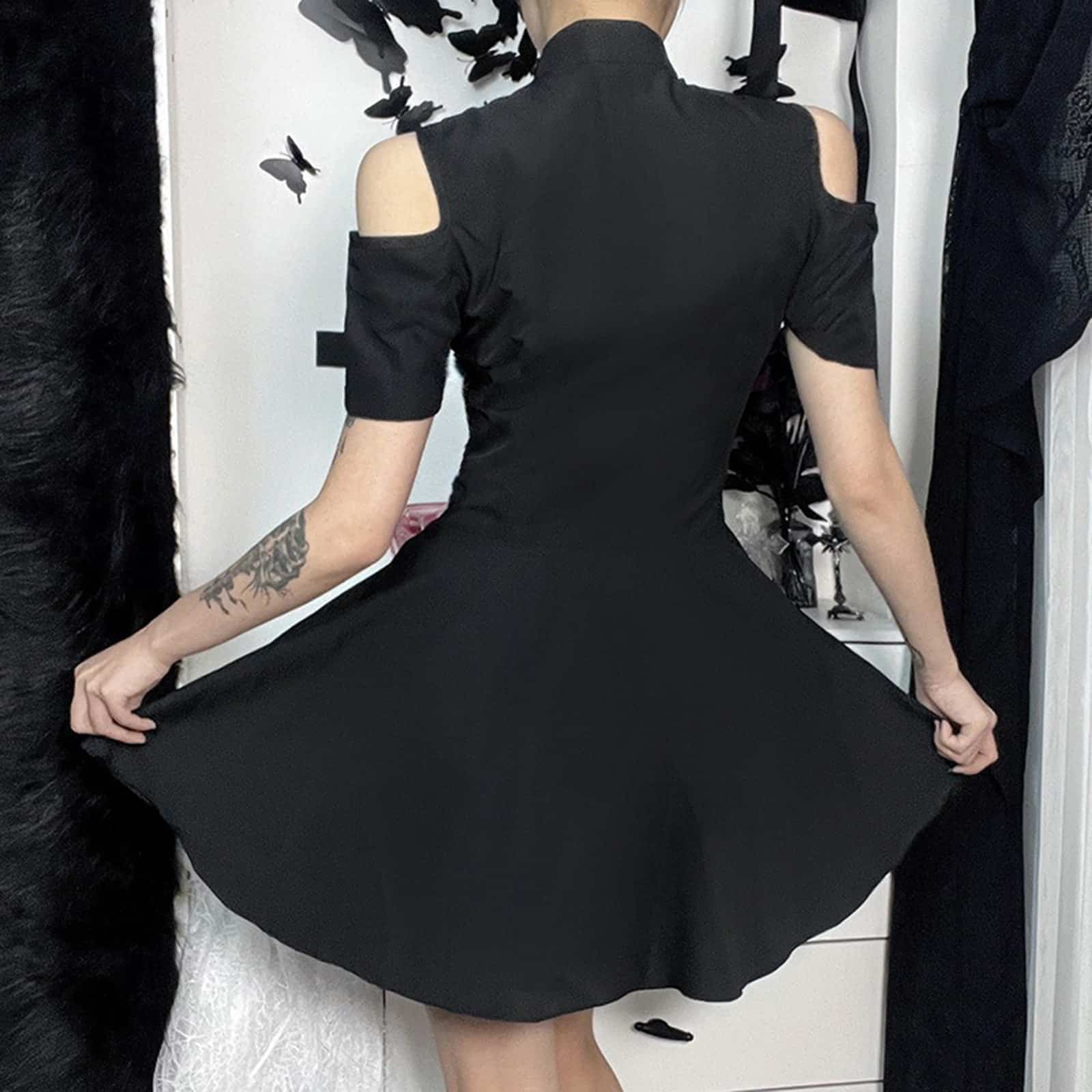 Schulterfreies Techwear Kleid mit breitem Ausschnitt und Schnallenverschluss am Halsausschnitt. Mit Frontreißverschluß und seitlichen Zierschnallen. Der Rockteil ist übbig geschnitten.