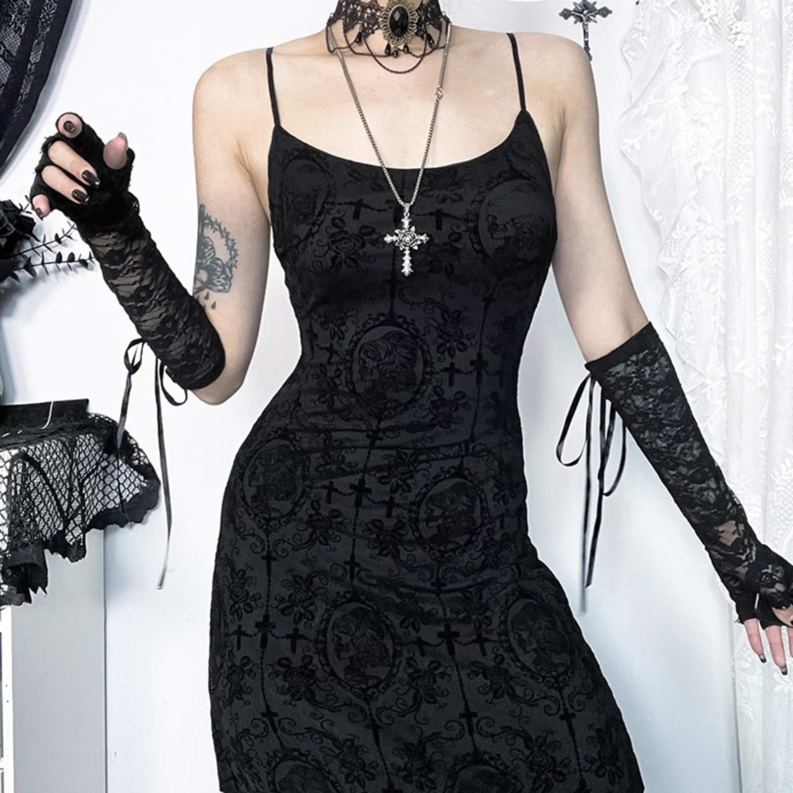 Ein elegantes Gothic-Maxikleid mit düsterem Charme und figurschmeichelndem Schnitt. Der samtige Stoff ist mit detailreichen Ornamentmustern und Sarg-Silhouetten verziert, die dem Kleid seine unverwechselbare Ausstrahlung verleihen. Schmale Spaghettiträger betonen die Schultern, während die lange, leicht ausgestellte Form für eine dramatische Silhouette sorgt. Vielseitig kombinierbar – ob mit Choker, Spitze oder Lederaccessoires – wird dieses Kleid schnell zum Highlight jedes Dark Fashion Outfits.