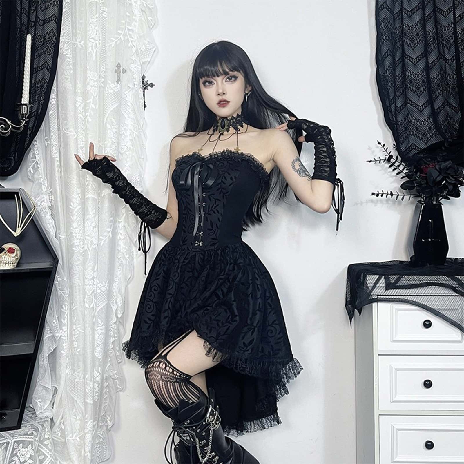 Verspielt, düster und voller Kontraste: Das Kleid „Crimson Shadows“ verbindet romantische Leichtigkeit mit markanter Gothic-Ästhetik. Das trägerlose Corsagen-Oberteil formt eine feminine Silhouette und wird durch dekorative Hakenverschlüsse sowie eine feine Zierschleife stilvoll akzentuiert. Der asymmetrische Rock mit fließenden Lagen und filigraner Spitze sorgt für Bewegung und verleiht dem Look eine geheimnisvolle Dynamik – perfekt für alle, die zwischen Eleganz und Rebellion tanzen.