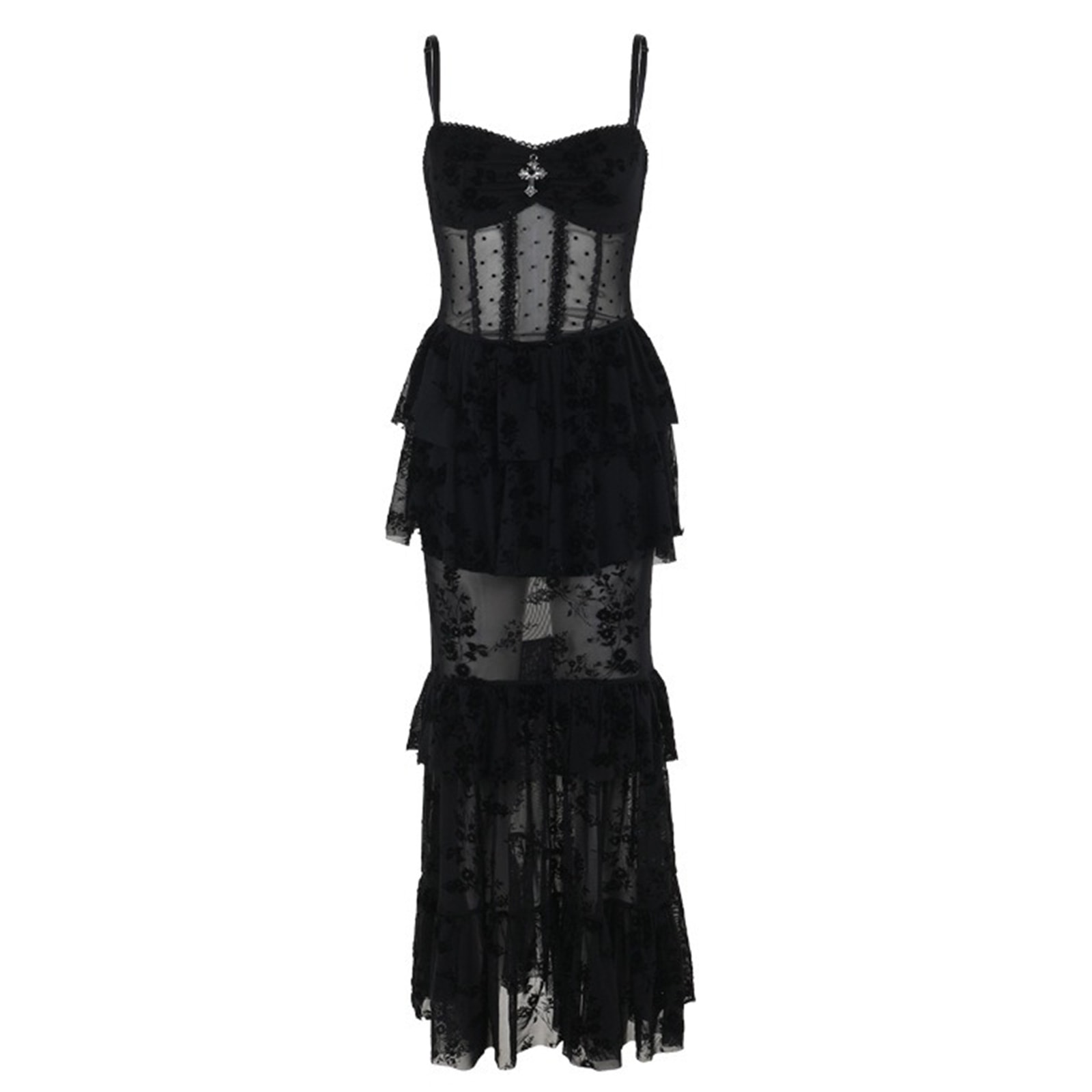 Verführerisch, geheimnisvoll und voller dunkler Eleganz: Das Kleid „Midnight Veil Siren“ vereint transparente Leichtigkeit mit markanter Gothic-Attitüde. Der fein beflockte Mesh-Stoff legt sich wie ein Schatten über die Haut und sorgt für faszinierende Tiefeneffekte, während die gestufte Silhouette mit Volants einen fließenden, fast schwebenden Look erzeugt. Das Korsagen-inspirierte Oberteil mit dezenten Struktur-Elementen betont die Figur und wird durch ein kleines Kreuz-Detail stilvoll akzentuiert – ein Kleid, das zwischen Anmut und Rebellion balanciert.