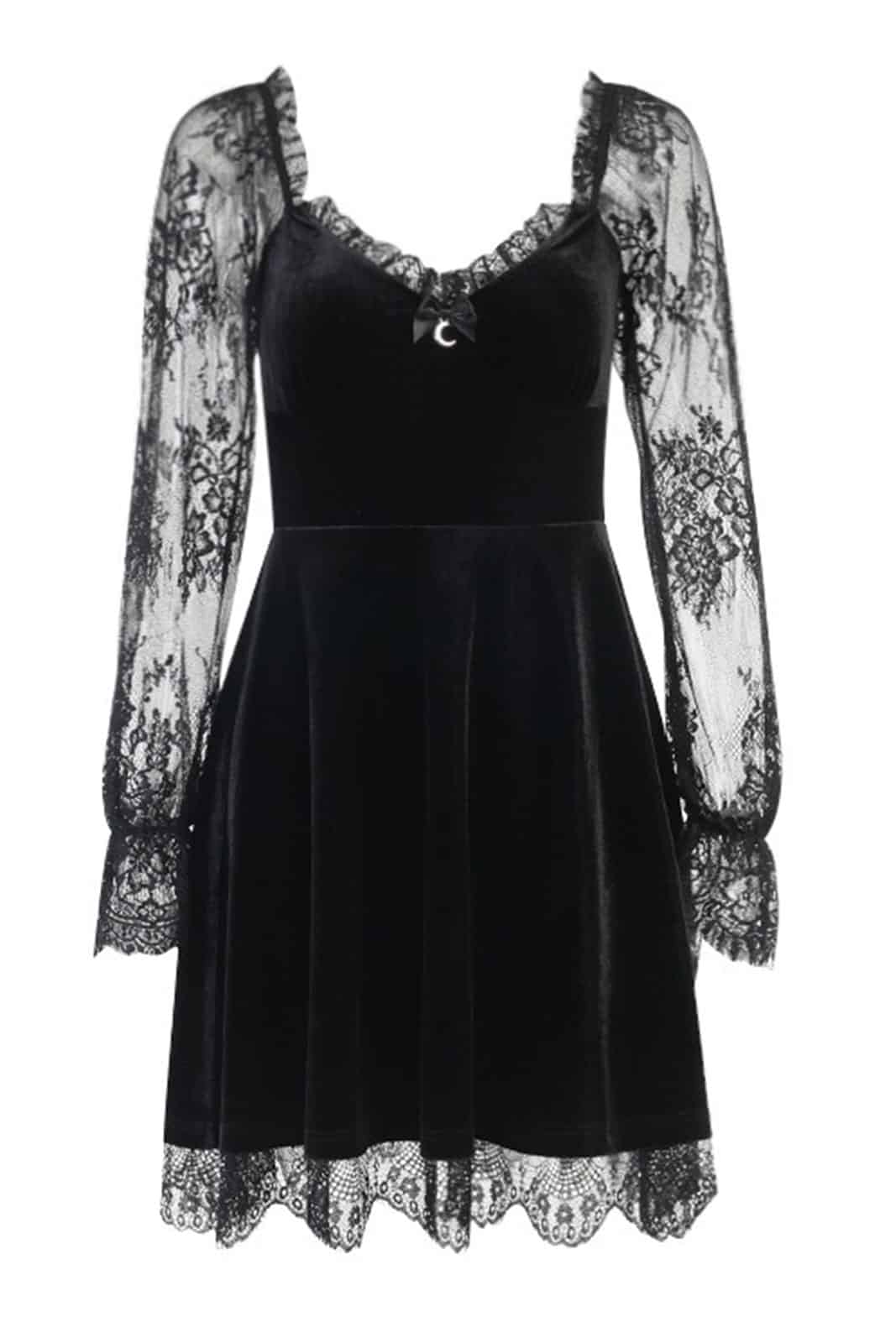 Pachschwarzes Kleid mit zarten langen Spitzenärmeln und breitem Carmenausschnitt. Der untere Saum und der Ausschnitt sind mit wunderschöner Spitze besetzt. Ein silberner Halbmondanhänger und eine kleine schwarze Schleife ziehen den Blick magisch auf sich.