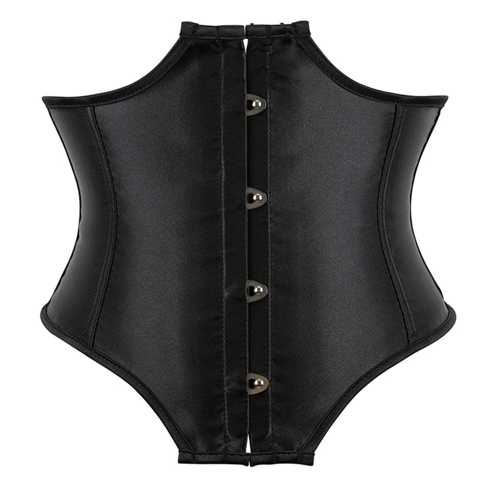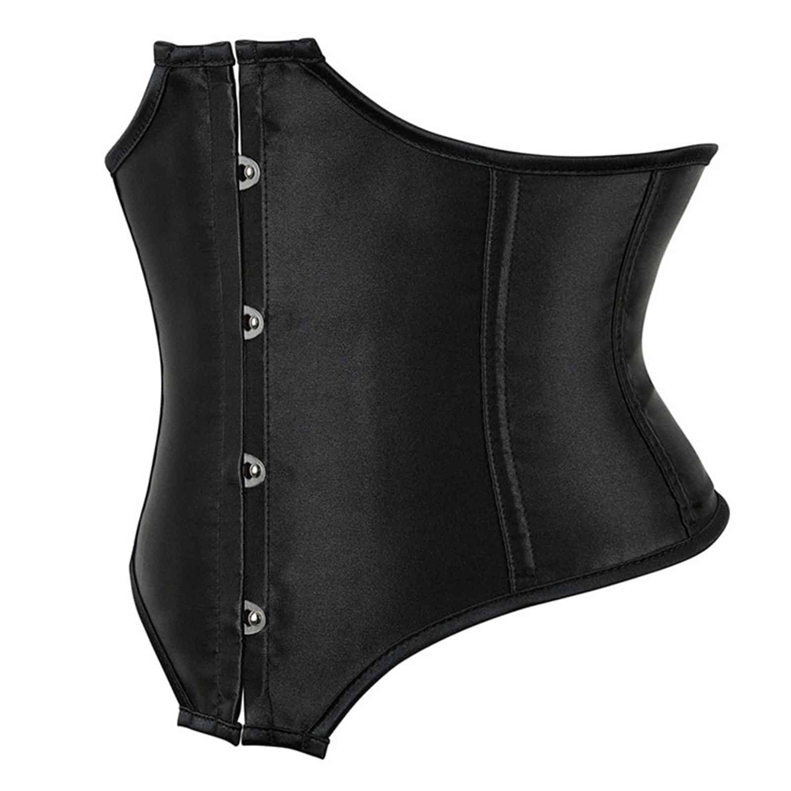 Im Schnitt aussergewöhnliches Unterbrustkorsett mit Kunststoffstäbchen, Rückenschnürung und Häkchenverschluß. Die Front ist extra lang geschnitten mit einem Maß von ca. 25cm Länge und vermindert sich rasch auf eine Länge von nur noch 15 cm im Rücken. Das weiche Material ist leicht glänzend und blickdicht.