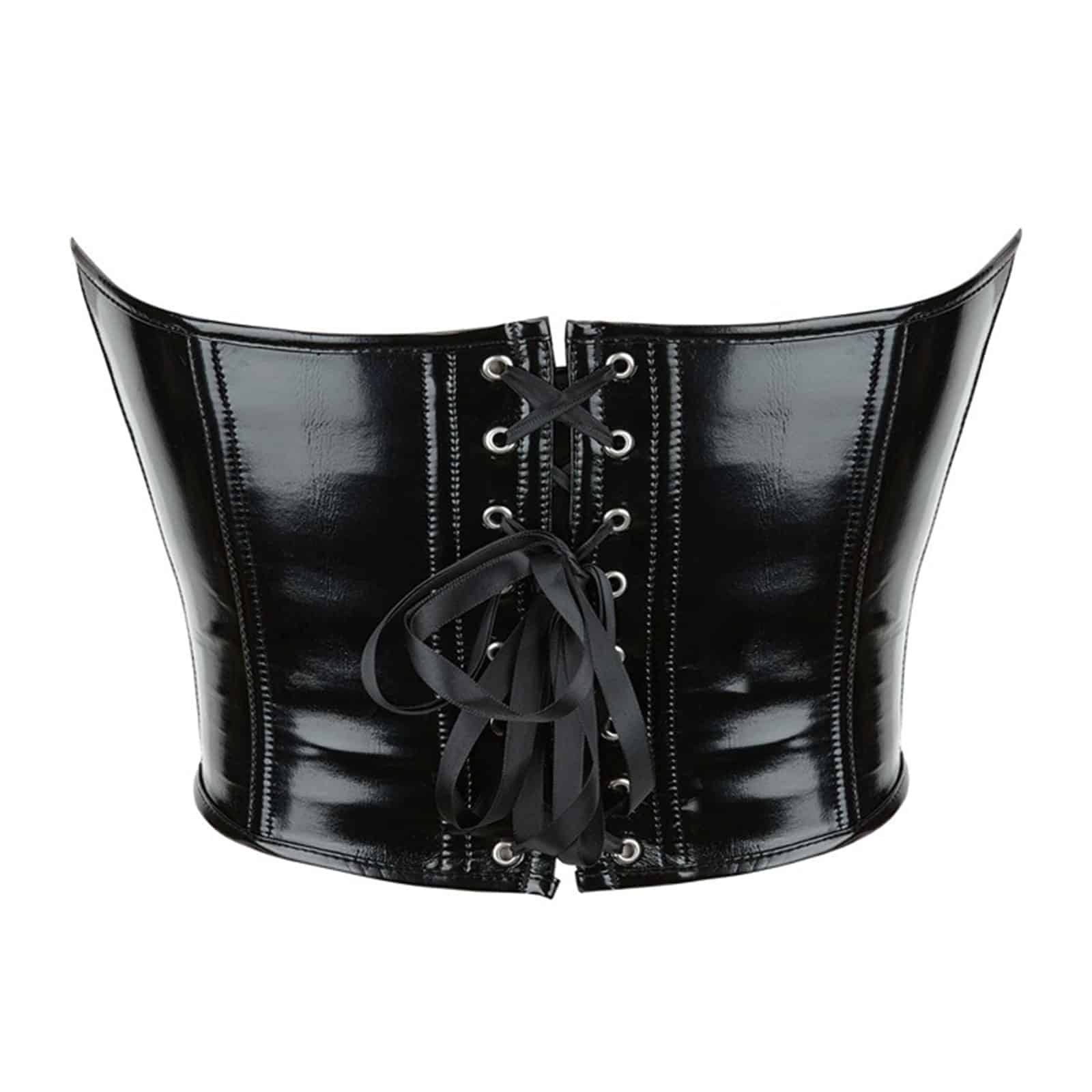 Klassisches Überbrustkorsett aus hoch glänzendem Lackstoff mit Kunststoffstäbchen und Rückenschnürung. Die Front ist geschlossen.